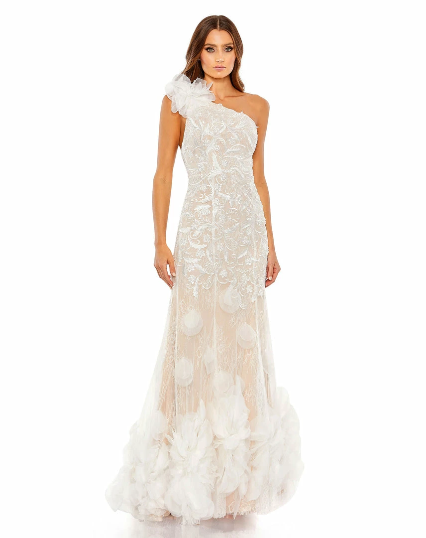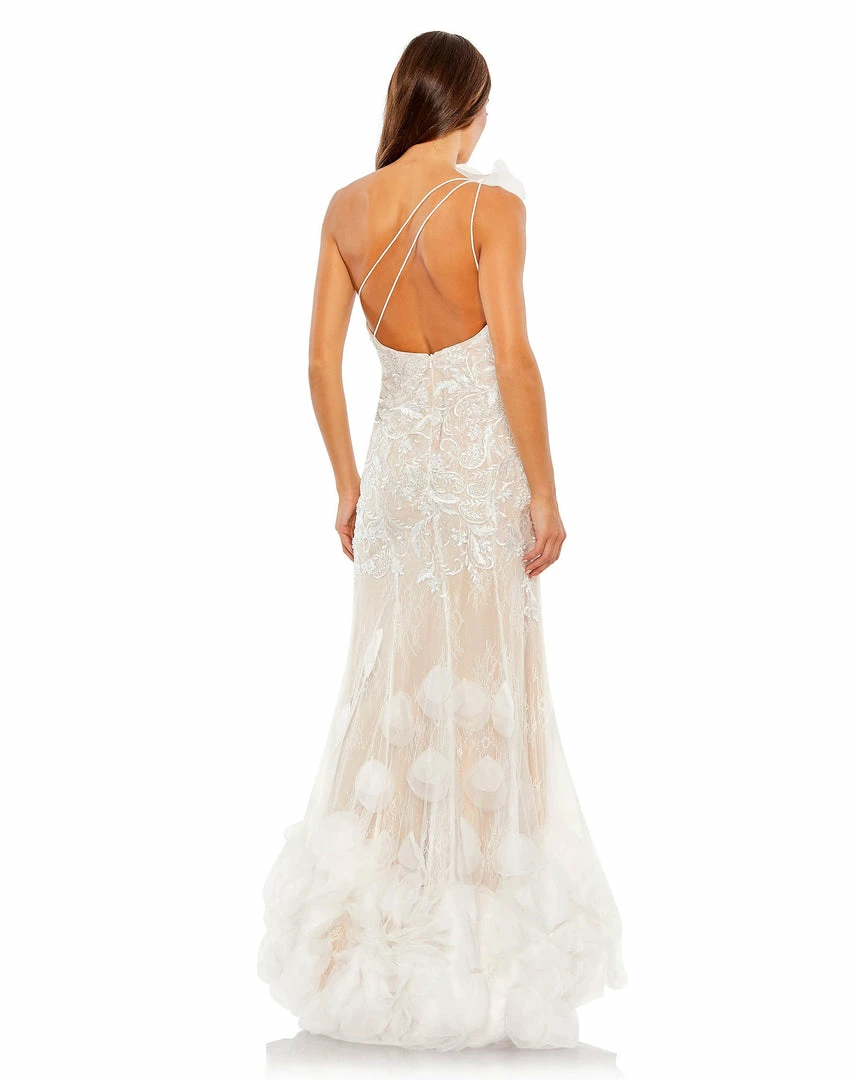 A trendy one-shoulder bodice. Embellishment and embroidery. Elegant lace. Romantic chiffon petals. This one-of-a-kind gown is our everything. The exceptional design looks beautiful and unique from every angle, finishing with an open and asymmetrical reverse.