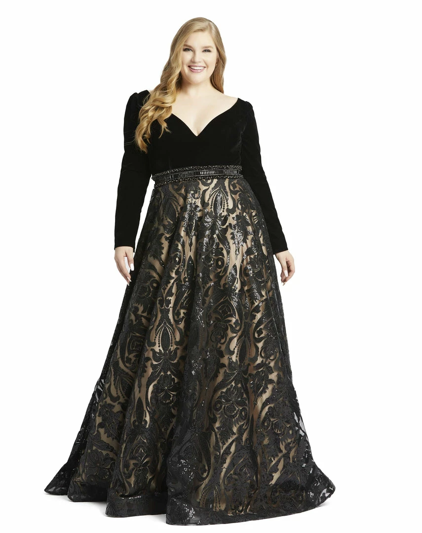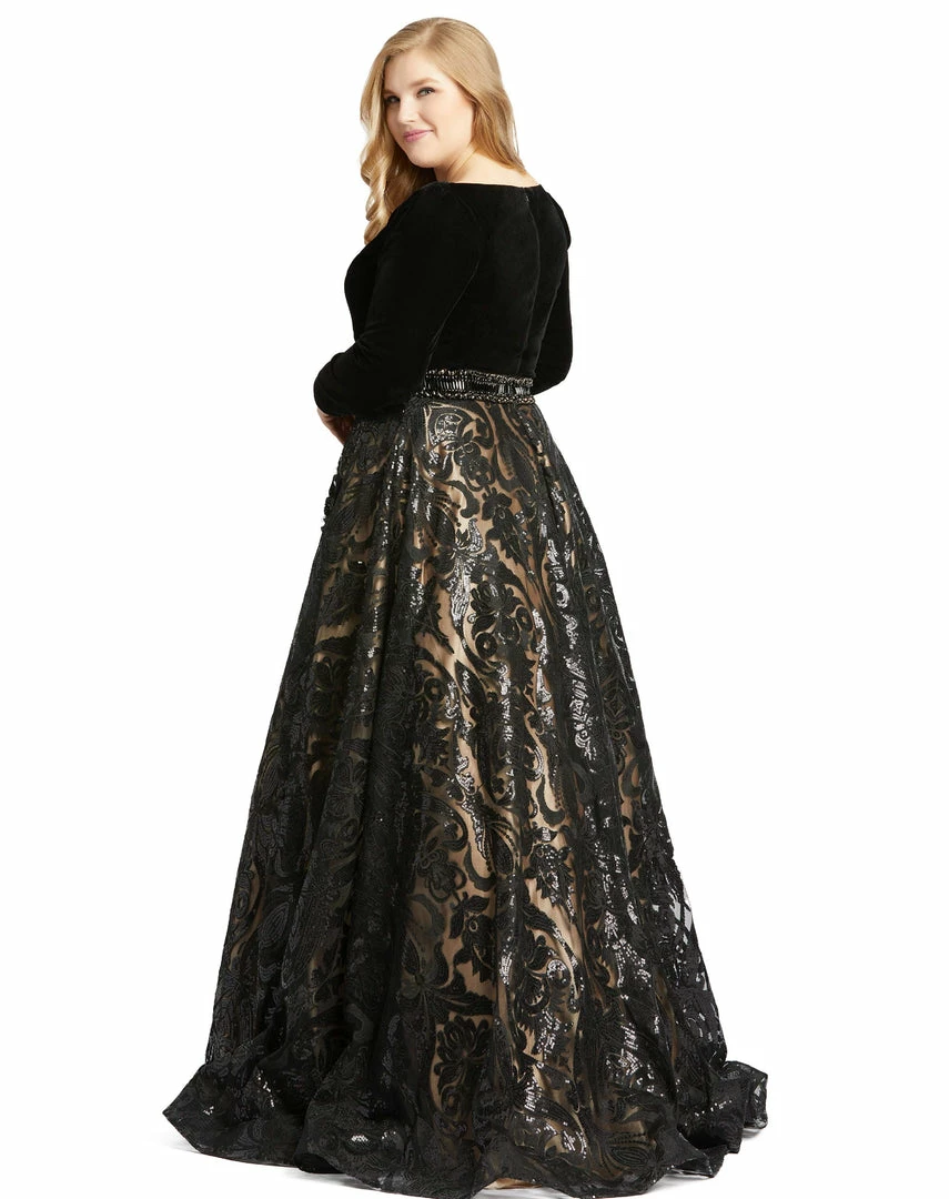 Beautiful evening gown with velvet bodice, beaded waistline, and intricate sequins detailing on the skirt.