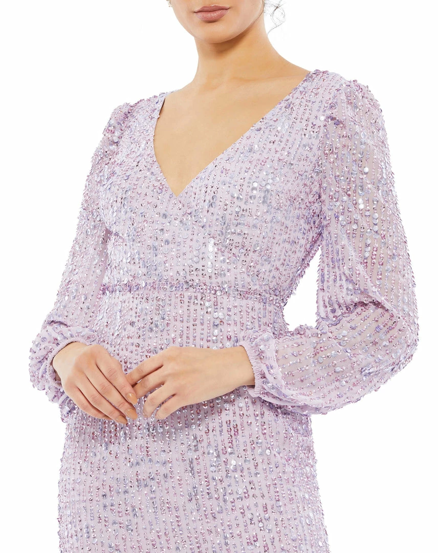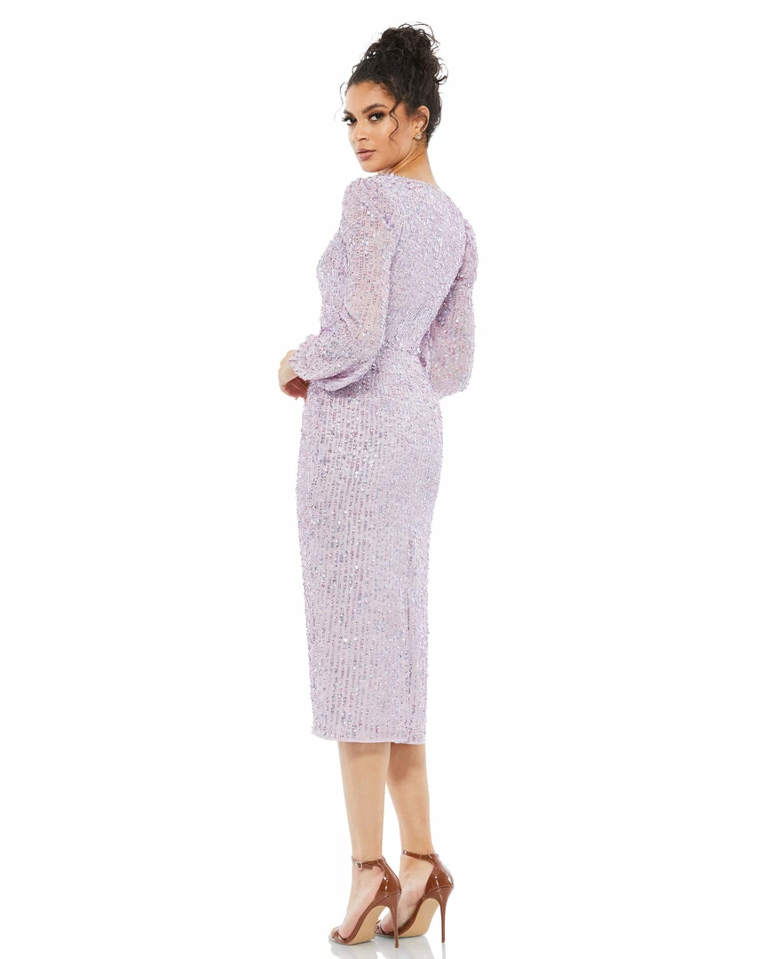 Sequined surplice cocktail dress with a faux-wrap v-neckline, long puff-shoulder blouson sleeves, and a chic midi-length skirt with a center back vent slit.