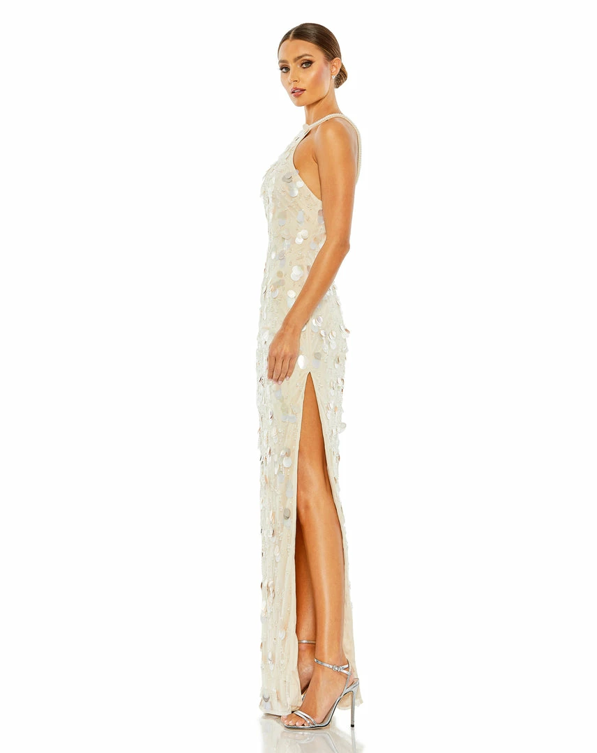 Hit up the dance floor in style with this party-ready dress. The groovy maxi is the definition of fun with shimmering paillettes, sequin clusters, swingy beads, and neckline pearls that transform into straps. Cut in a clean-lined column shape, the dress has cutaway shoulders, a bare back, and a side slit for easy movement.
