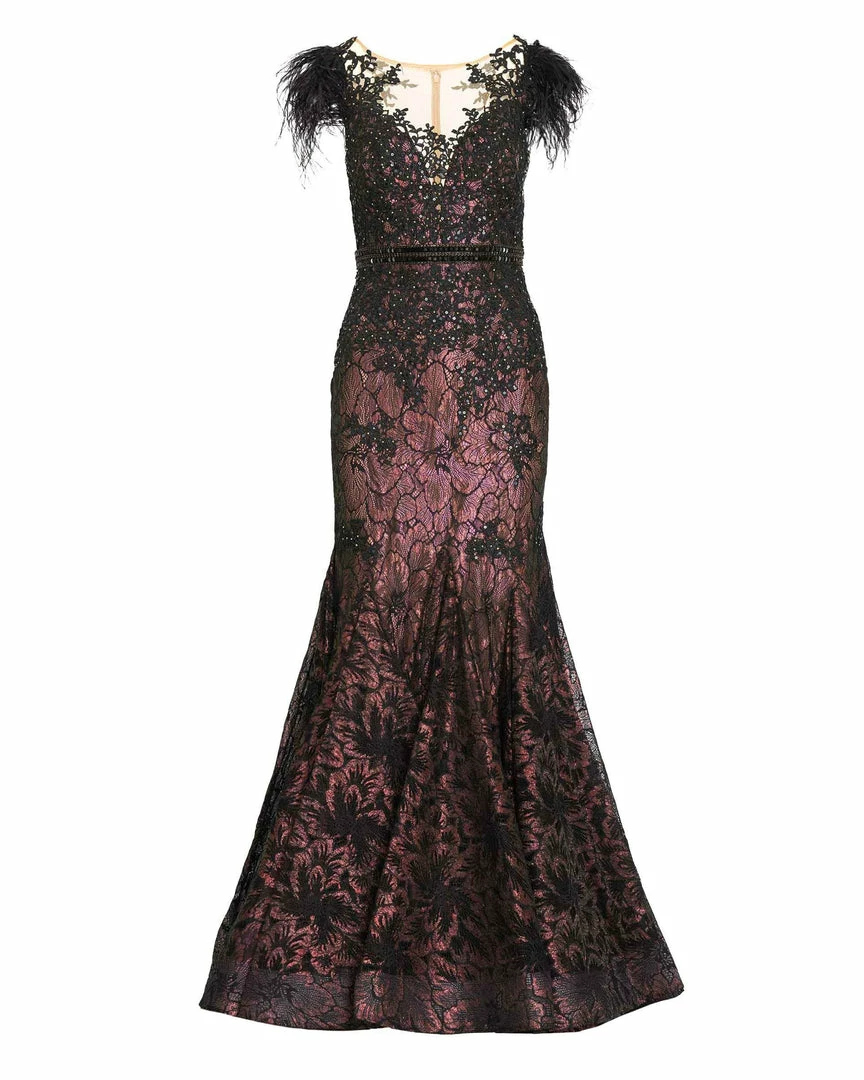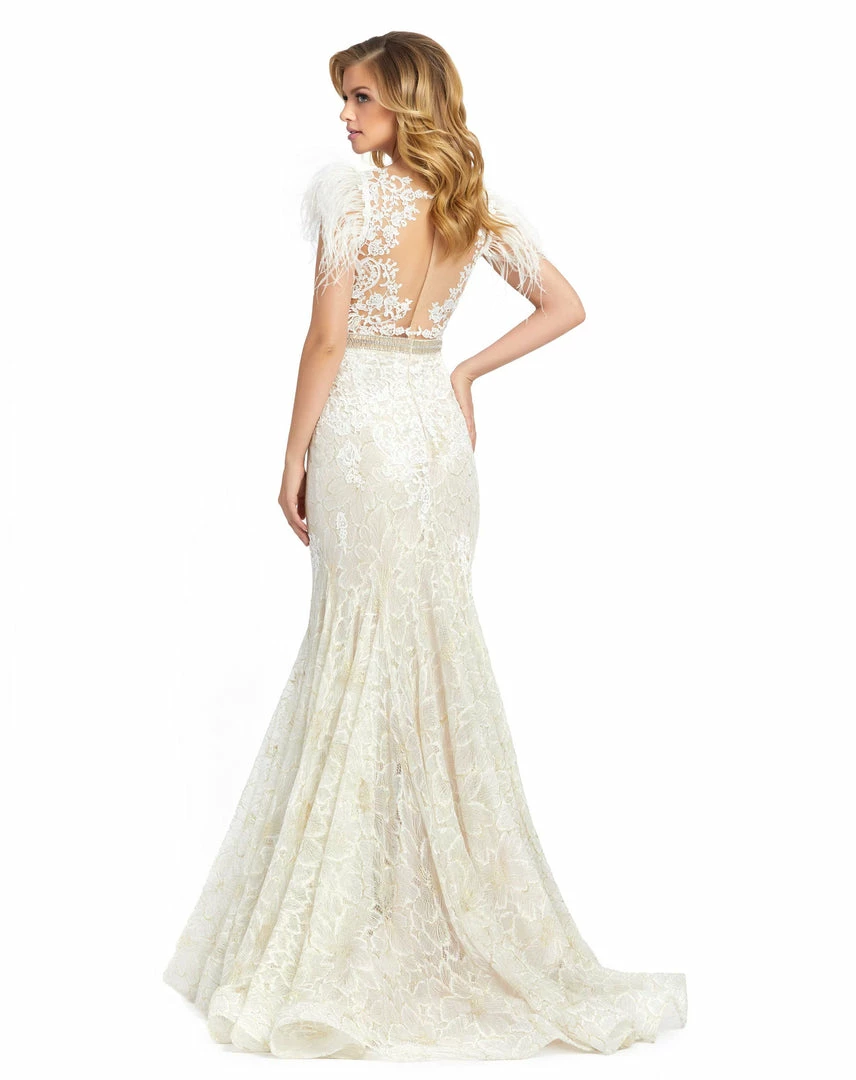 Mac Duggal Embellished Feather Cap Sleeve Illusion Neck Trumpet Gown