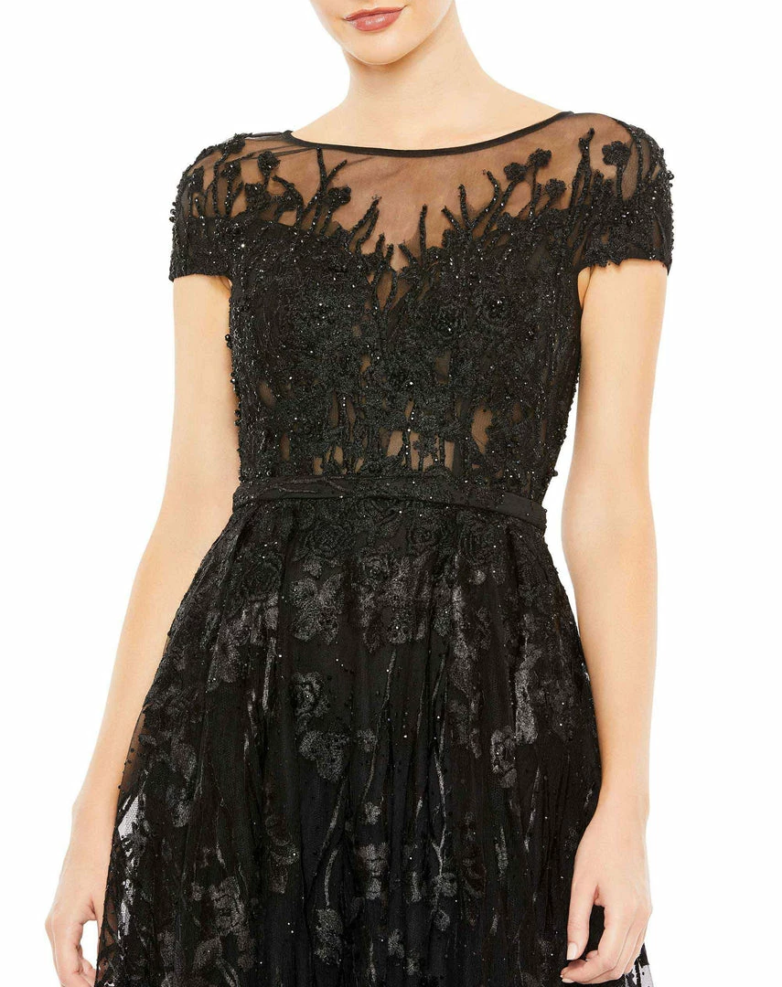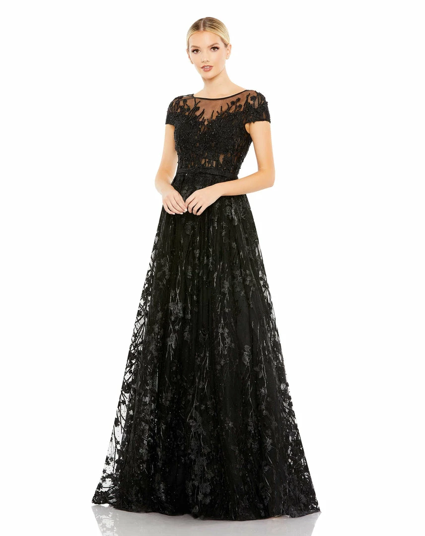Be a vision in this masterfully crafted gown styled with a partially sheer, short-sleeve bodice, twinkling embellishments, and floral silhouette embroidery. Cut in an elegant A-line shape, the beautiful gown ensures you top the best-dressed list at any formal event, gala or wedding.