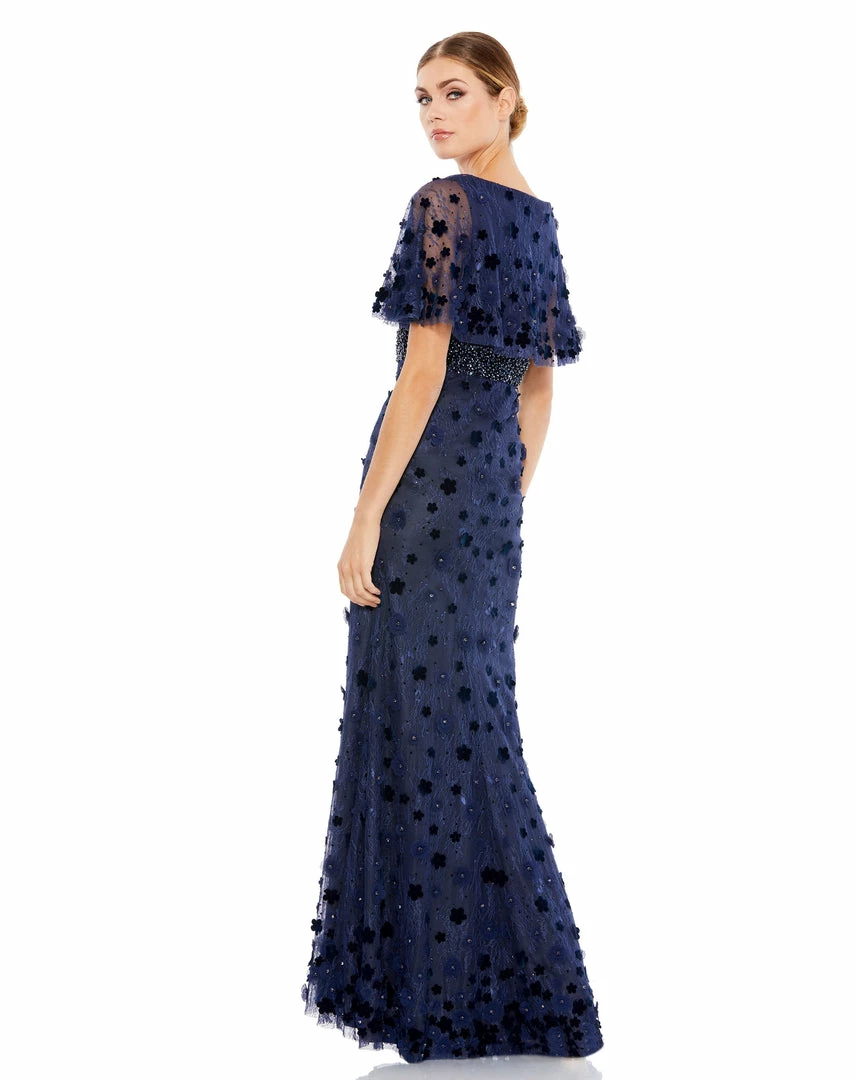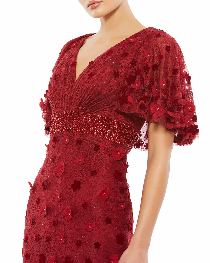 Floral embellished lace gown with beaded accents throughout, a hand-beaded belted empire waist, and semi-sheer butterfly sleeves.