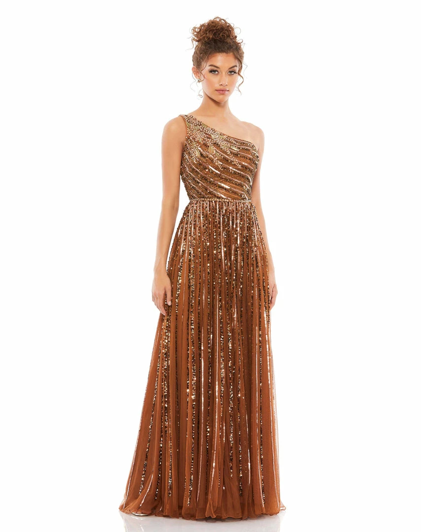 This stunning one-shoulder A-line gown is embellished with cascading diagonal rows of sequins and beads throughout the mesh overlay. The focal point of this gown is the beautiful bead work that lays at the top of the bodice. A dainty hand-beaded belt sits at the natural waist.