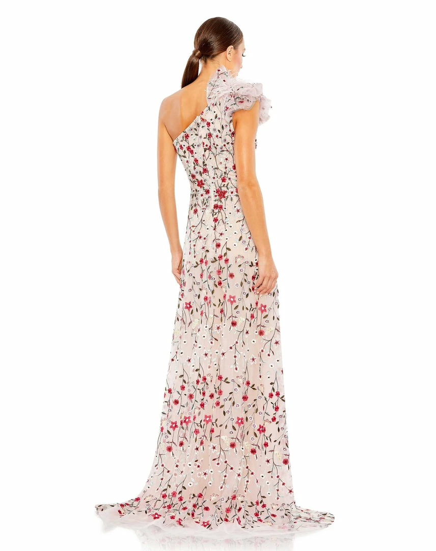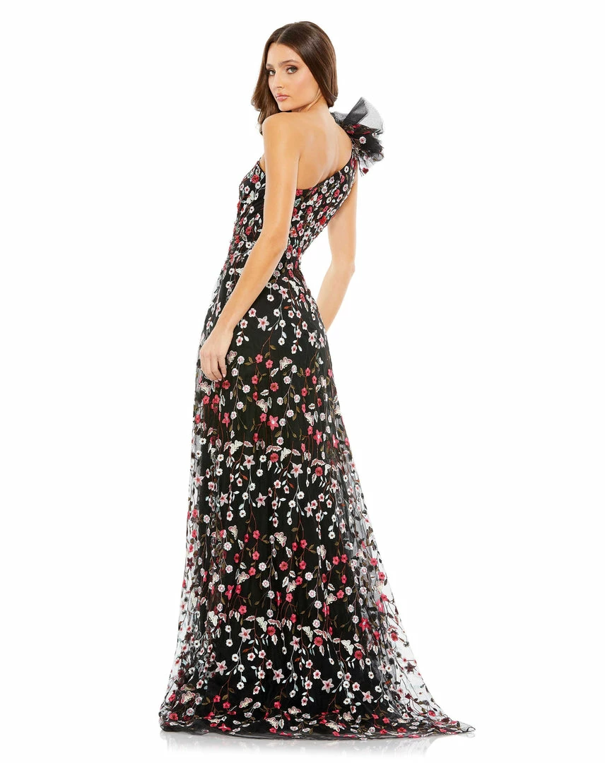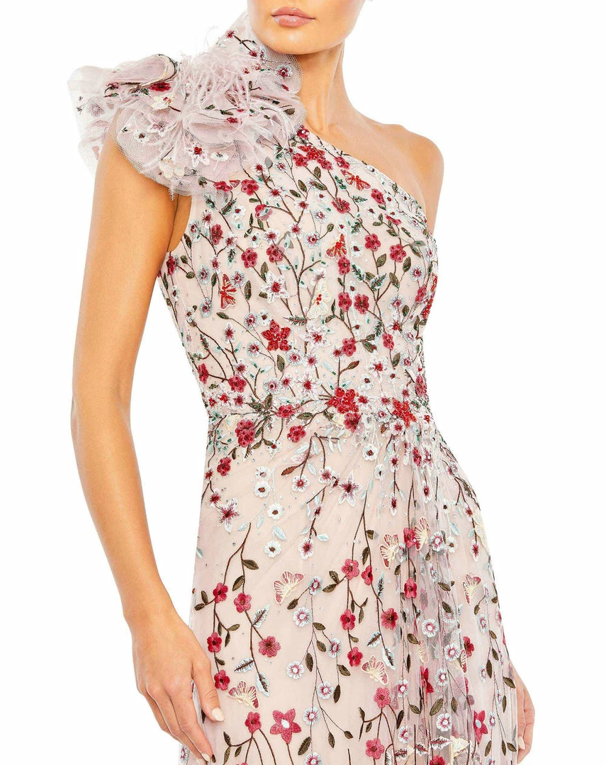 Sweet meets sexy in this divine one-shoulder gown. Cut from embroidered tulle in a flower and butterfly garden motif, this feminine dress shows off a single shoulder made with delicate, ruffled layers and a spray of ostrich feathers and a sheer front drape that flanks a revealing leg slit.