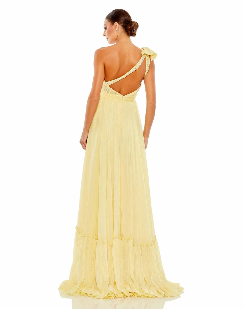 Designed in metallic-striped chiffon for a subtle hint of shimmer, this two-in-one gown has a single bow-topped shoulder on one side and a strapless neckline encrusted with glam embellishments on the other. The gown’s pleated waistband and ruffle-edged skirt bring out a romantic feel.