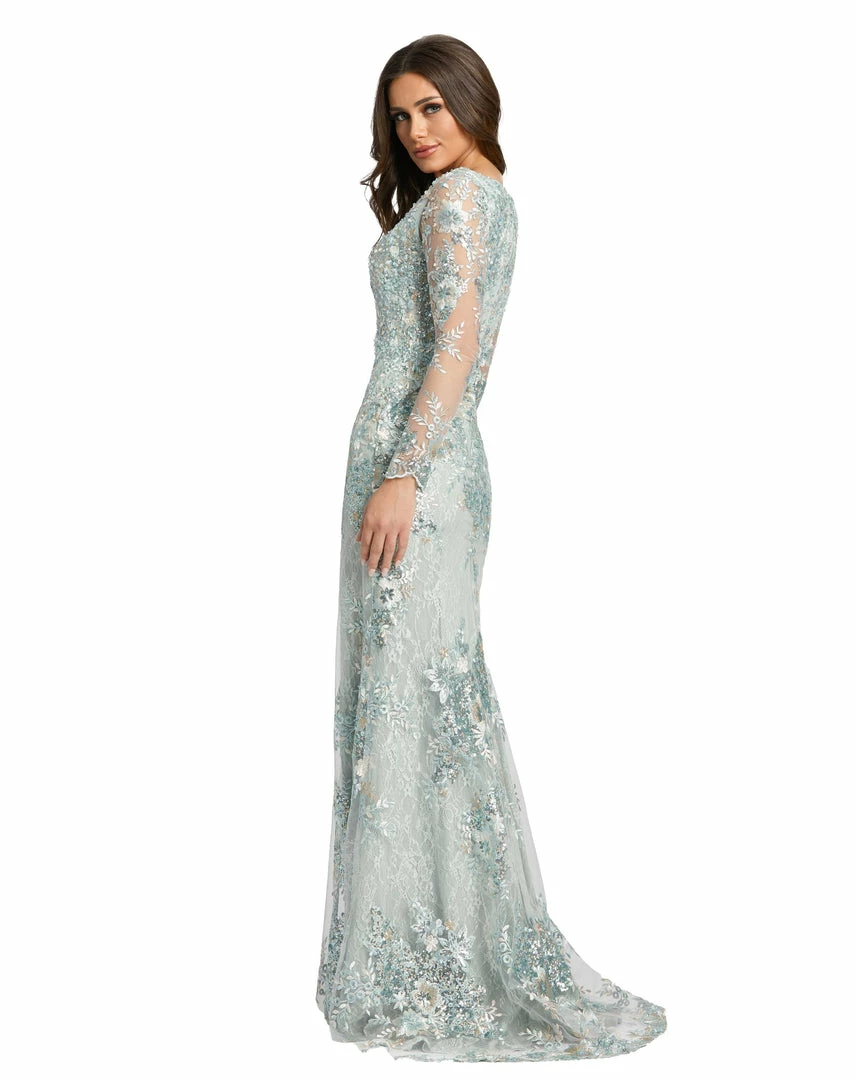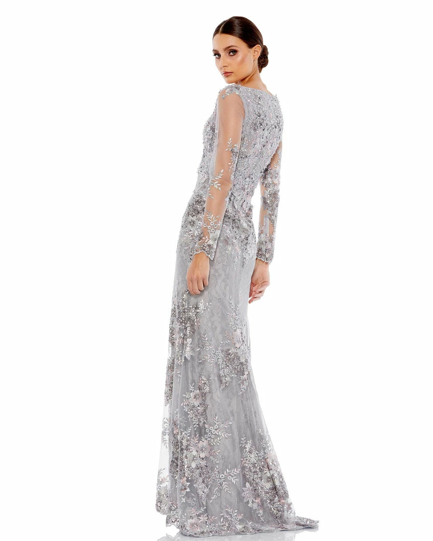 Mac Duggal Embellished V Neck Illusion Long Sleeve Gown