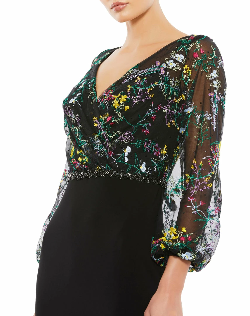Mac Duggal Embroidered Illusion Puff Sleeve Column Gown