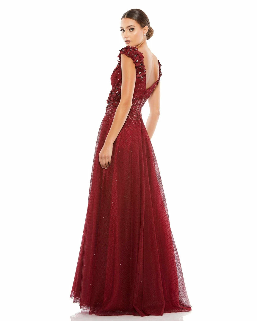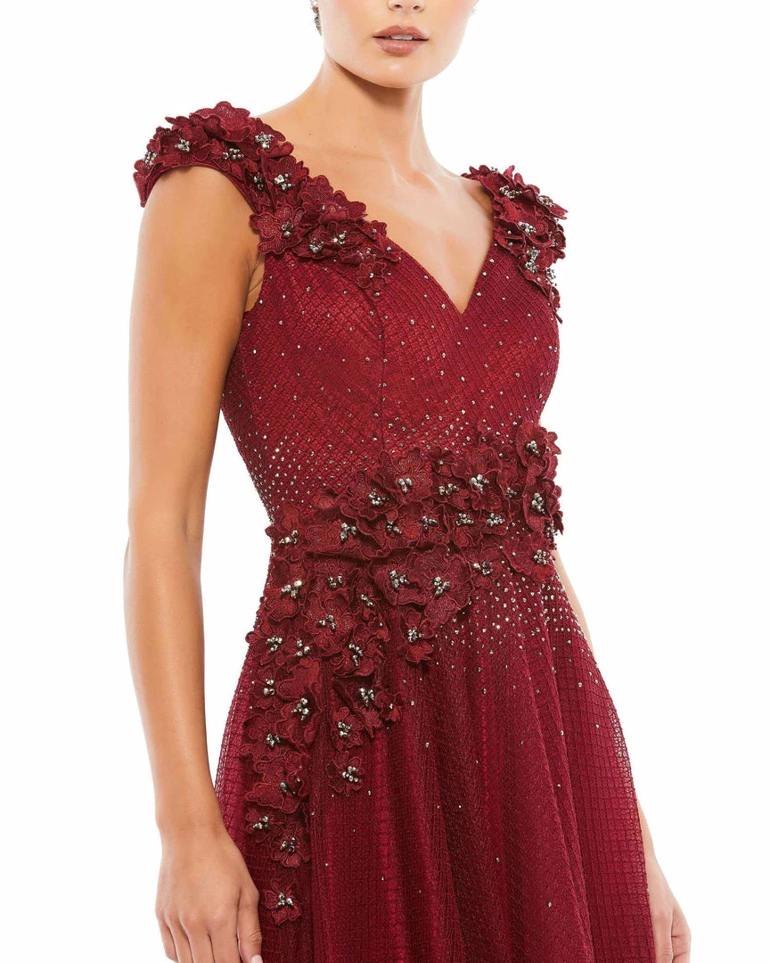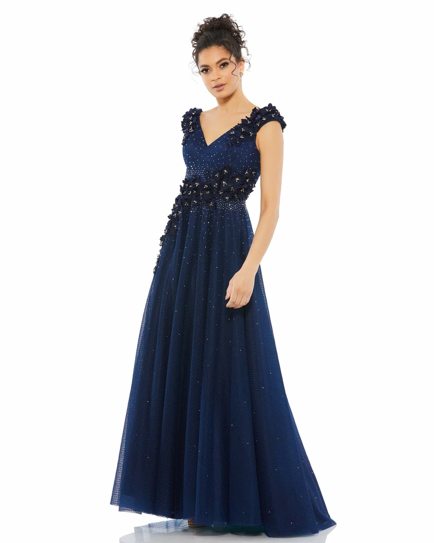 Floral applique A-line gown accented with 3D flowers and heat-set crystals at the shoulders and natural waist.