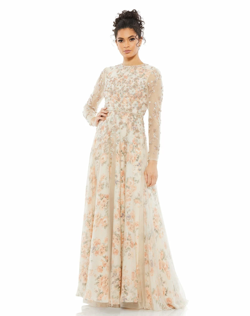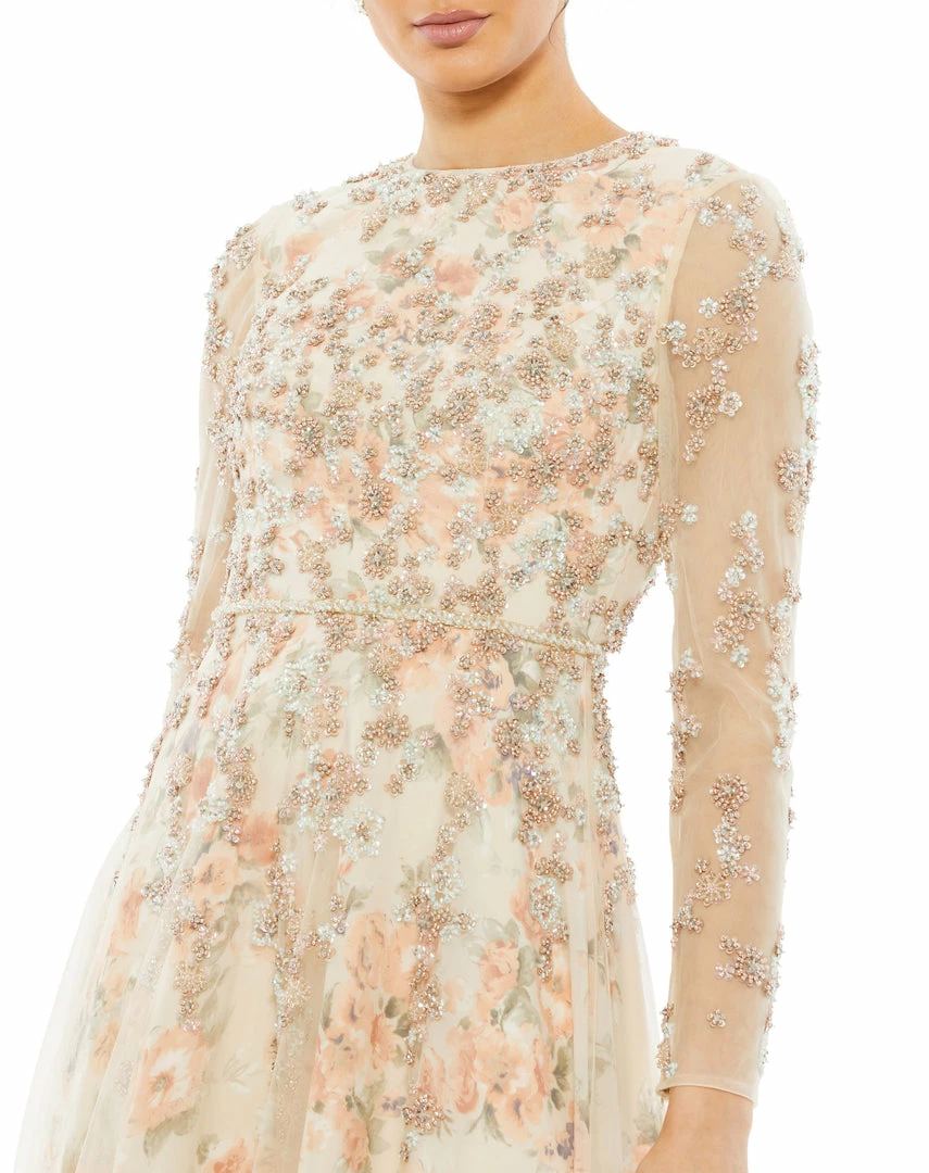 Beautiful floral printed gown with hand-beaded flowers across the bodice and semi-sheer sleeves, a delicate beaded belt, and a flowing floor-length skirt.