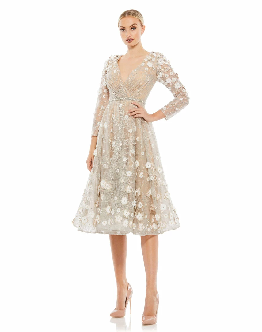 Elegant 3/4 sleeve a-line cocktail dress with a faux-wrap v-neckline, rhinestone-embellished belted waist, and gorgeous 3D floral applique and jewel accents throughout the lace overlay.