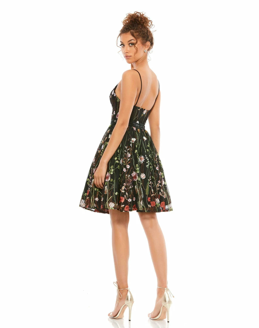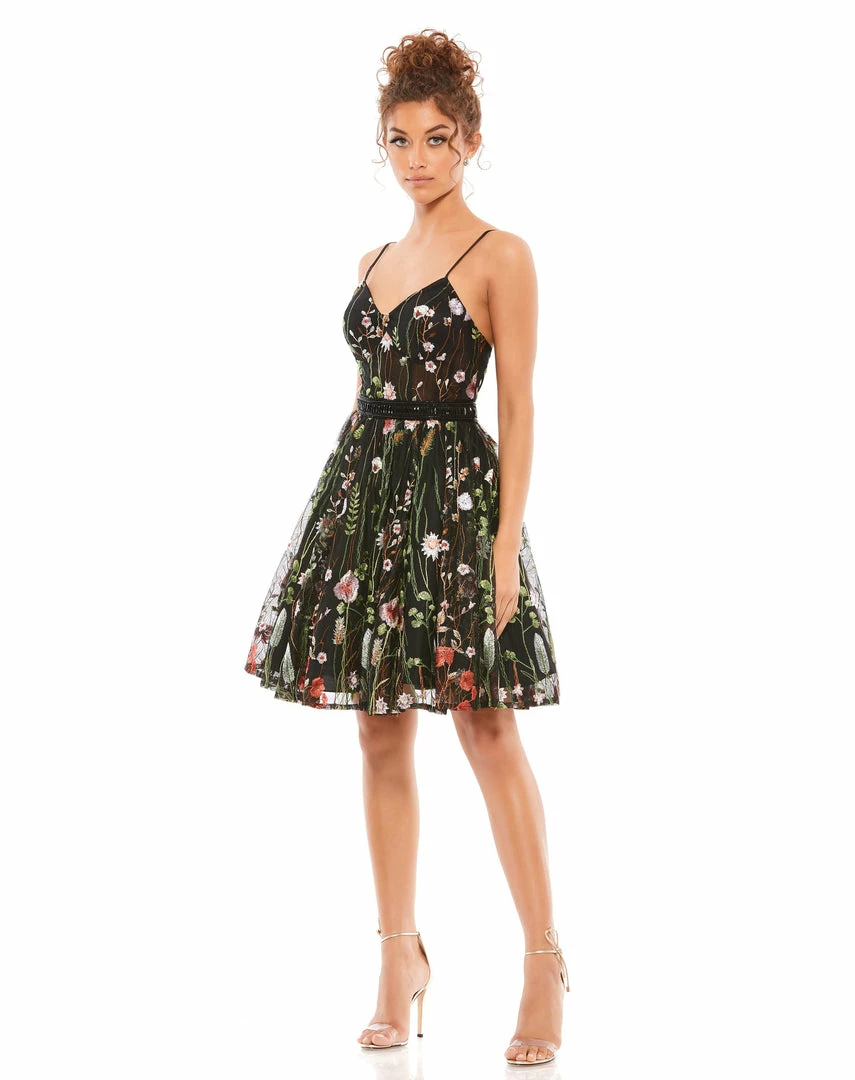 This floral-embroidered cocktail dress features a sheer mesh bustier-style bodice, v-neckline, and an A-line skirt with tulle for added structure. The waist is accented by a hand-beaded belt.Â