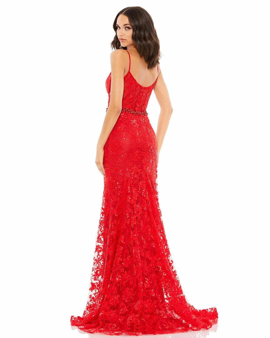 Sexy floral lace bustier gown accented with sequins throughout, hand-beaded belt, and a scalloped train.