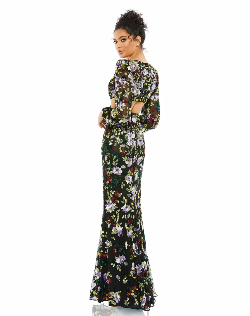 With a plunging neckline and sexy cutouts, this gown is a stunner. The semi-sheer blouson sleeves feature a slightly puffed shoulder, and the fitted, floor-length skirt skims the body with a slightly flared bottom. The mesh overlay is hand-embellished with floral-patterned sequins.