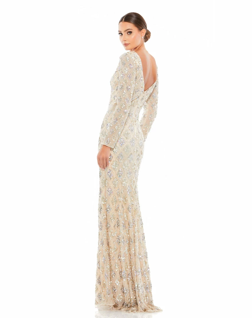 Ombré evening gown with geometric embellishment throughout the mesh overlay. This elegant long-sleeve evening gown features a hand-beaded belt at the natural waist and a floor-length trumpet skirt.