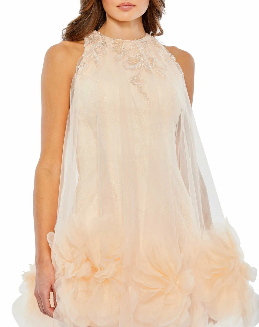 This playful design starts with a mini sheath featuring cutaway shoulders and neckline embroidery. A trapeze-cut layer of tulle adorned with oversized floral poufs tops the leggy underlay for a look that’s modern, youthful, and oh-so-chic. Highlight the flirty hem with lengthening stilettos.