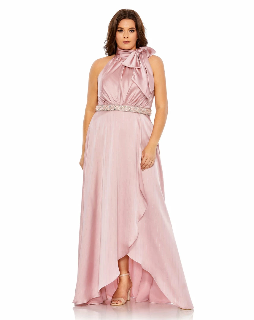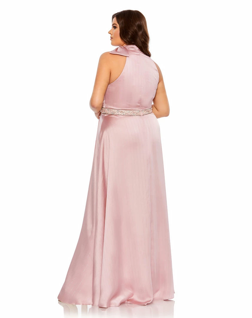 Mac Duggal High Neck Soft Tie Beaded Belt Gown (Plus)