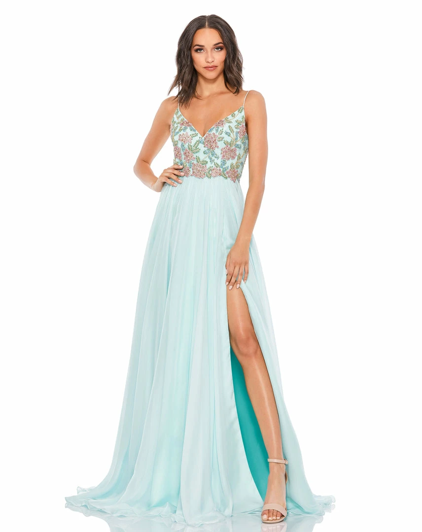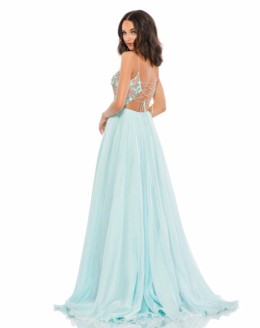 Glimmering embellishments on top, flowy, elegant chiffon at the bottom. This picture-perfect gown is cut with as stylish silhouette that showcases a V-neckline, barely-there straps, and fluid A-line skirt with a front slit. You’ll love the corset-inspired lace-up back.
