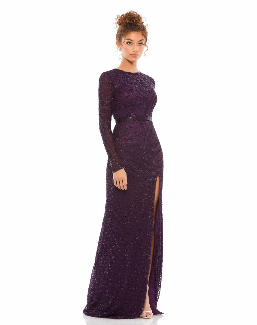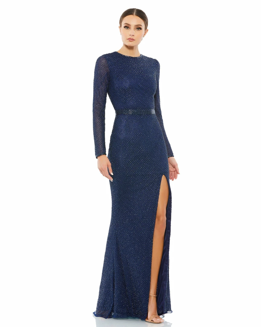Long sleeve evening gown features a lattice-beaded mesh overlay, hand-beaded belt, and a thigh-high slit.