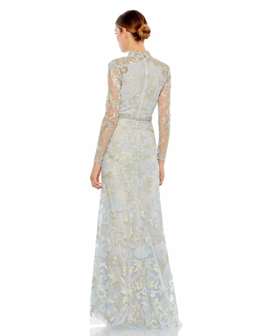 Long sleeve v-neck gown with decorative metallic-gold applique and embroidered detail throughout. Natural waist is accent by a hand-beaded belt.