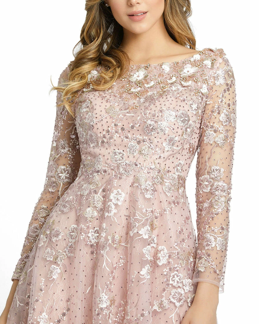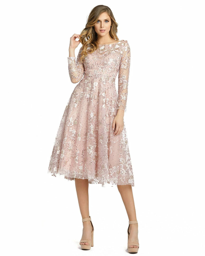 Mac Duggal Long Sleeve Floral Embroidered Tea Length Dress