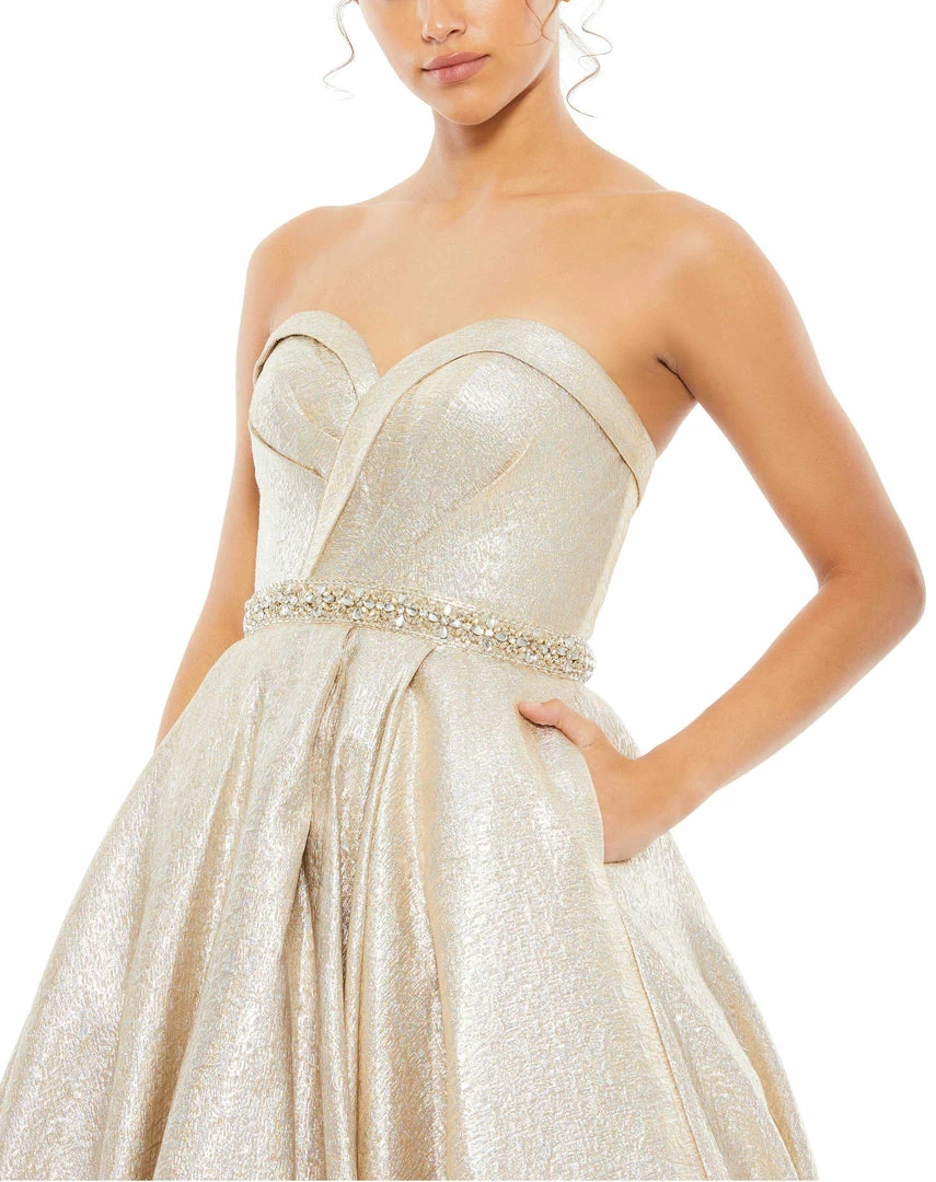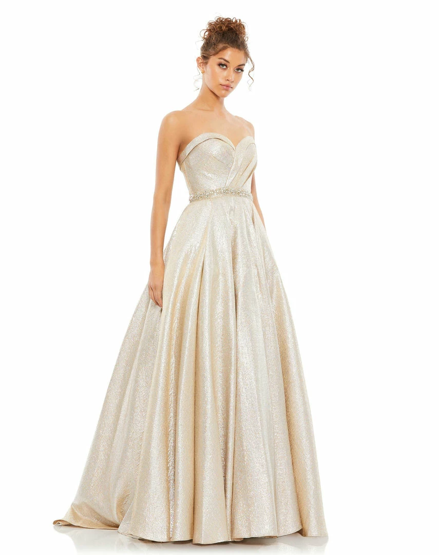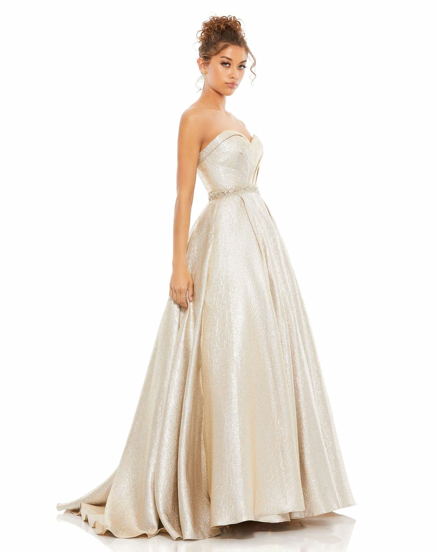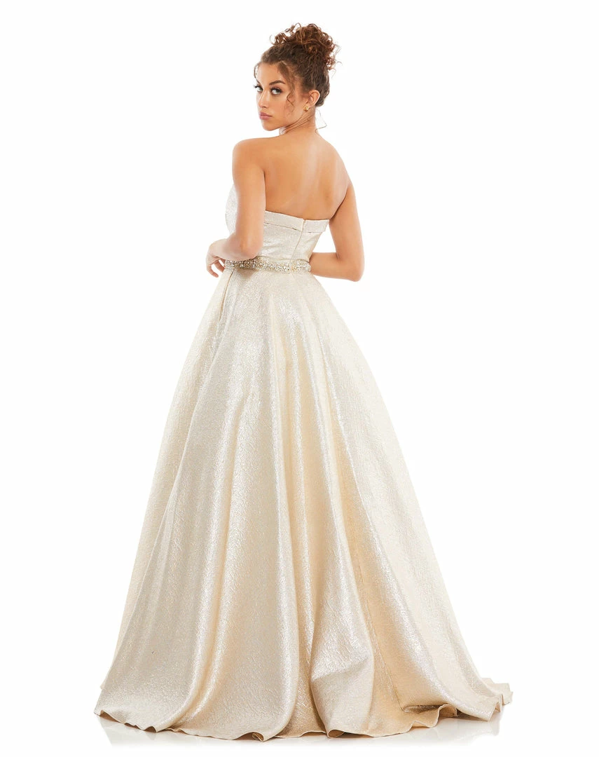 Shimmering metallic ball gown with a rhinestone belt and ruched bodice.