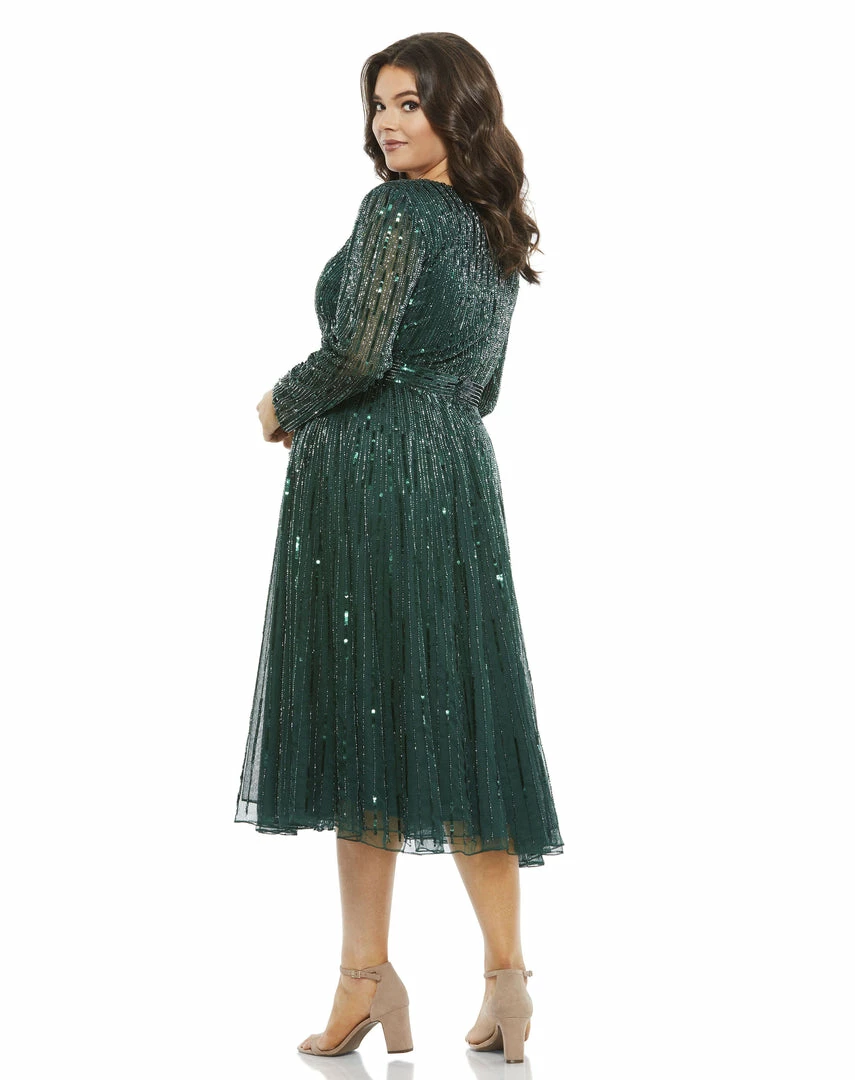 Fully embellished with vertical rows of tons sequins and beads, this dress brings the shine. The fitted bodice, sequined waistband, and flowing a-line skirt create an ultra-flattering silhouette, while the v-neckline and semi-sheer sleeves add a a bit of sexiness to this tea-length cocktail dress.