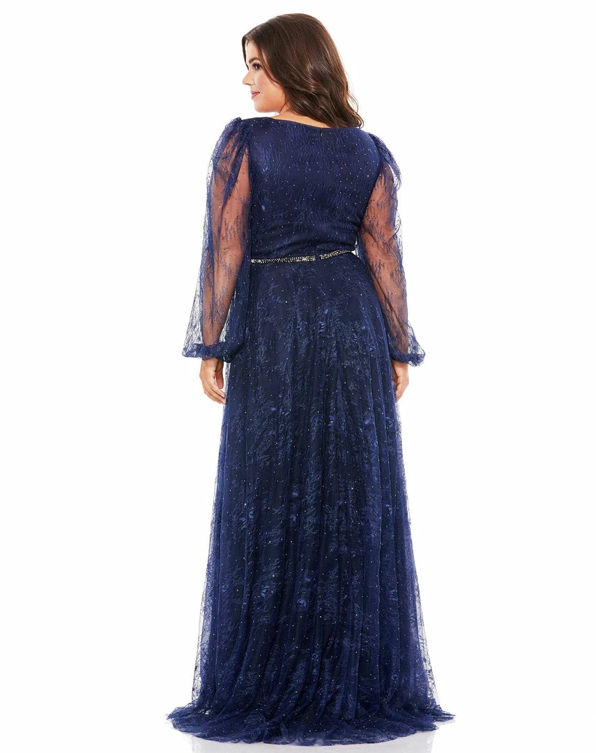 Whimsical midnight gown with a handmade rhinestone belt, lace overlay, and illusion blouson sleeves.