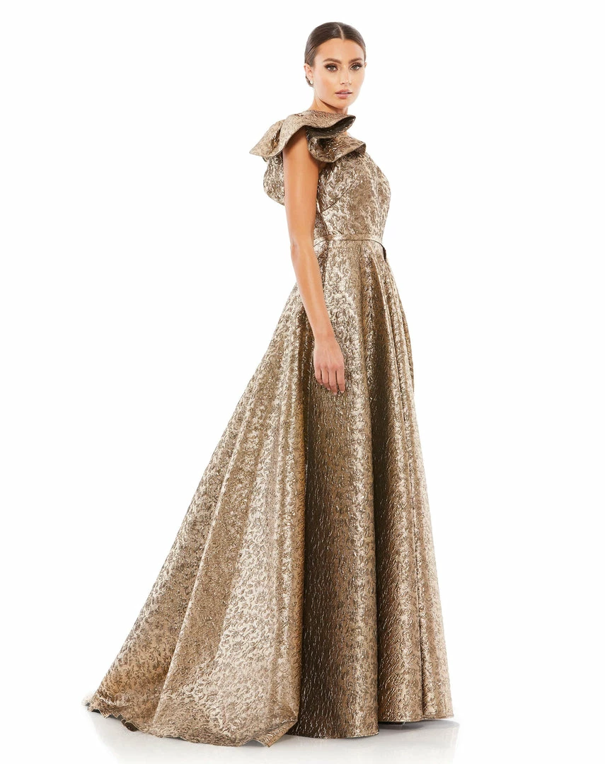 One-shoulder metallic brocade ball gown accented with a thigh-high slit and pockets.