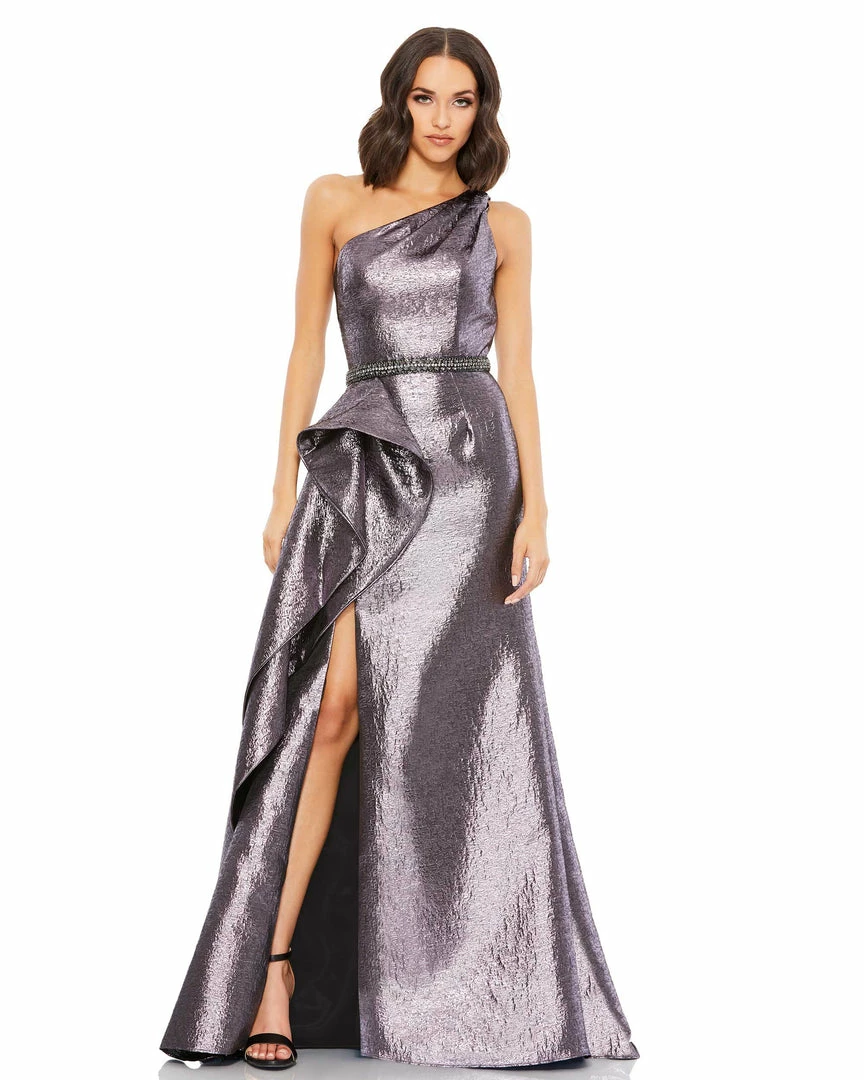 One shoulder shimmering metallic gown with a rhinestone belt and ruffle-accented thigh-high slit.
