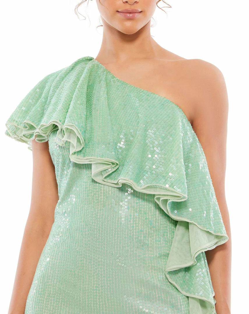 Flirty, fully-sequined one-shoulder mini dress with a dramatic cascading asymmetrical ruffle from shoulder to bottom hem.