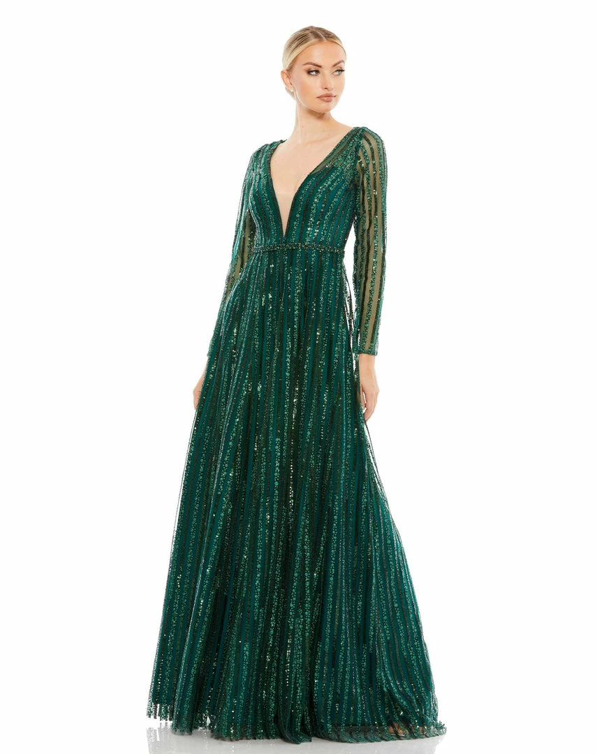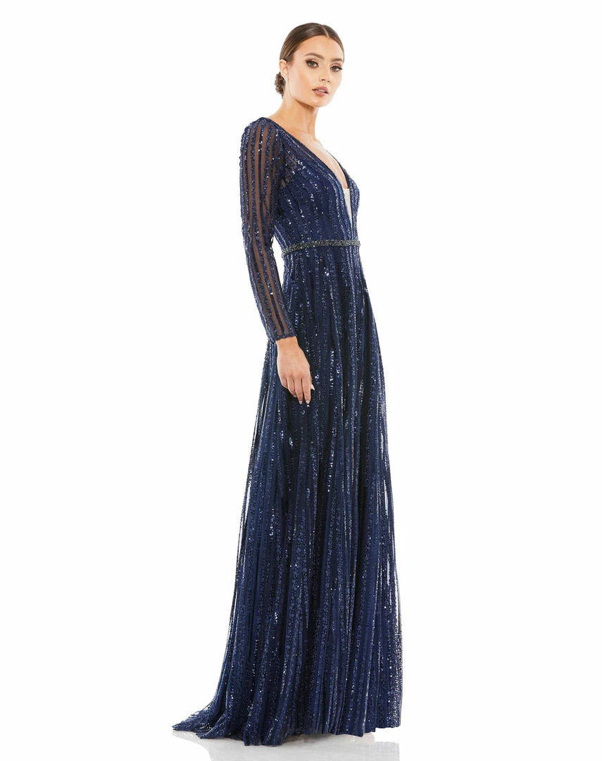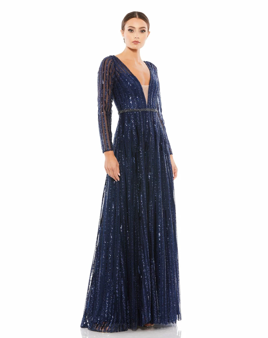 Sequin striped A-line gown with semi-sheer sleeves and back and a hand-beaded waist. Plunging sweetheart neckline features a sheer mesh inset mid-bust.