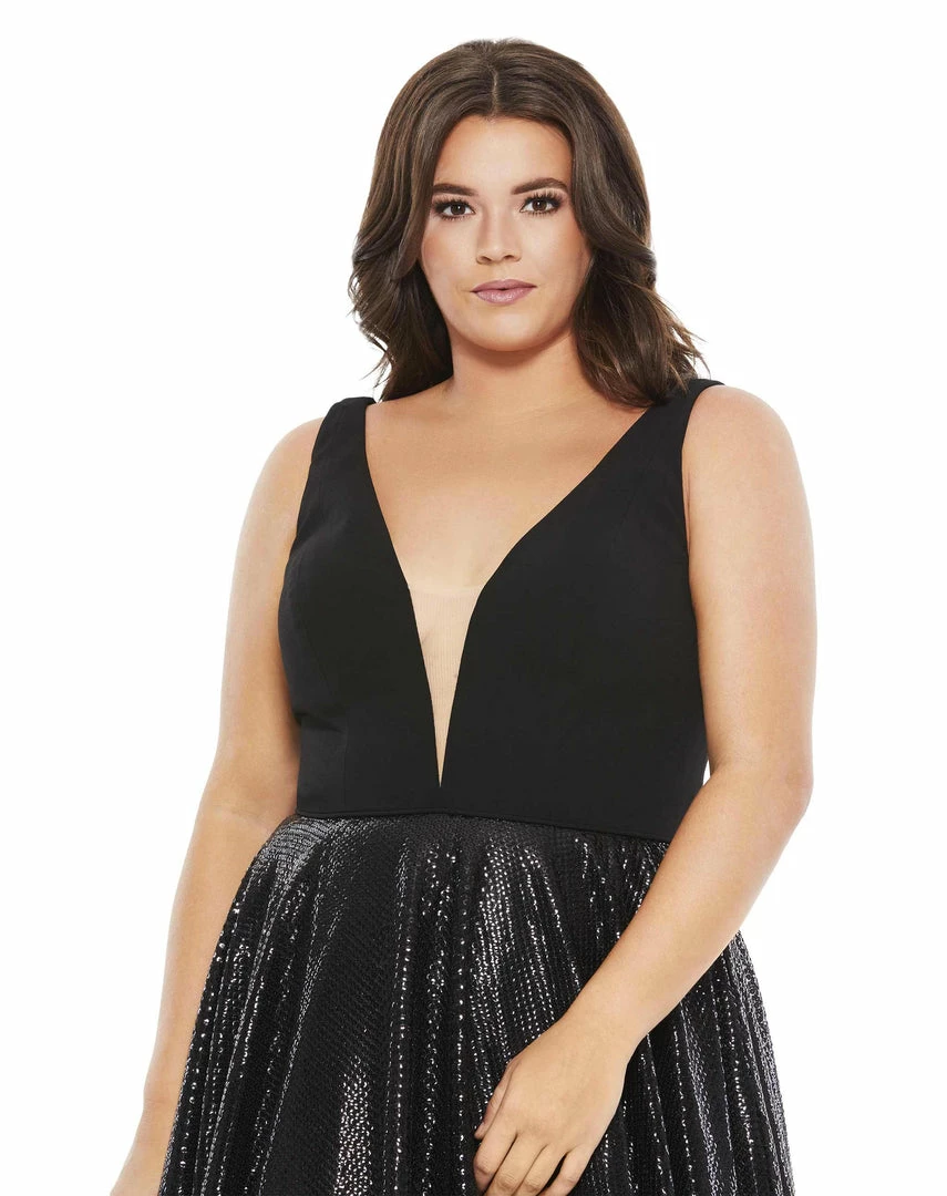 Plunging black ball gown with mesh insert at bra line and dramatic sequined skirt.