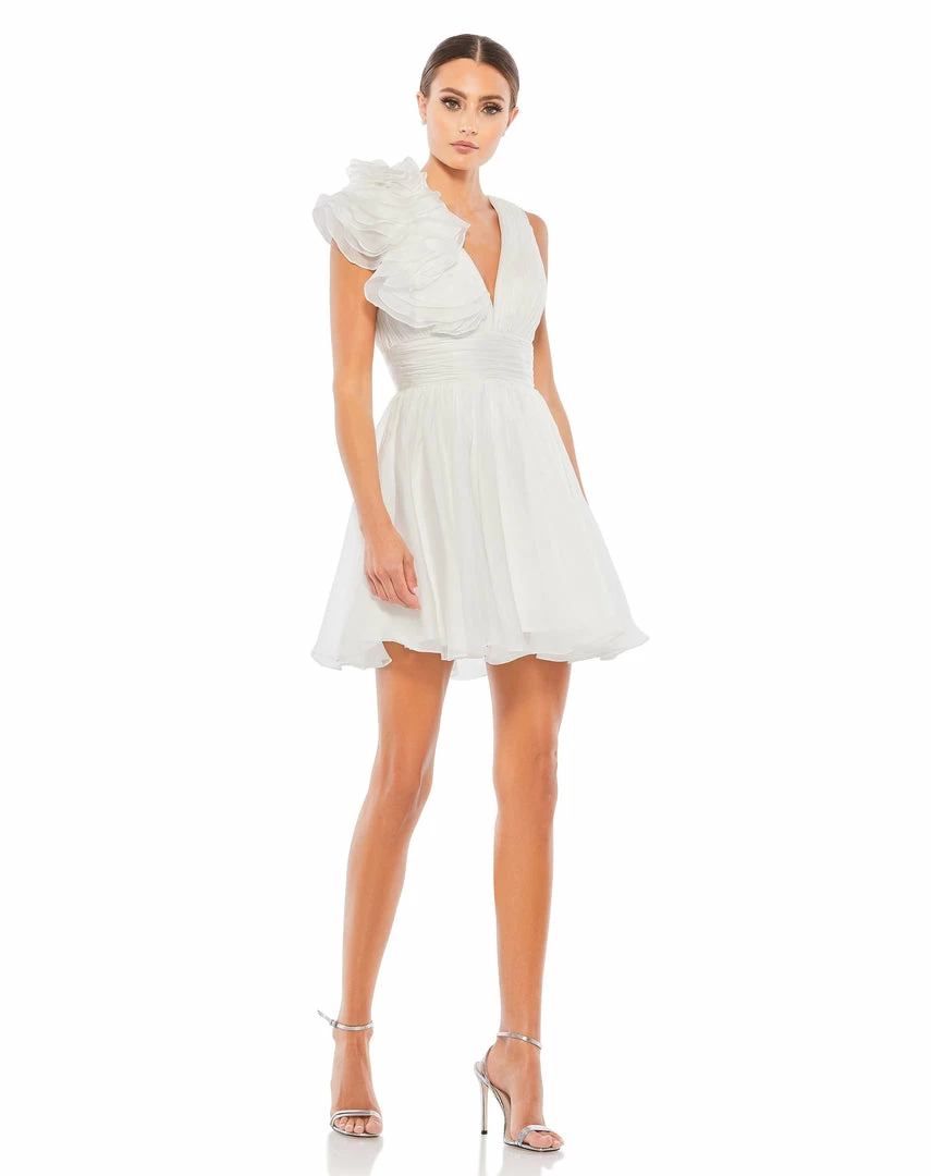 Chic chiffon cocktail dress with a plunging v-neckline, pleated bodice and waistband, a low square back, and a layered pleated skirt. A dramatic rosette accent sits at the right shoulder.