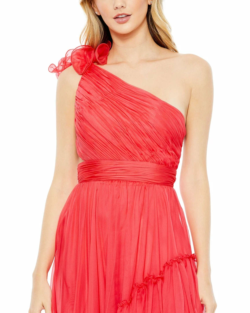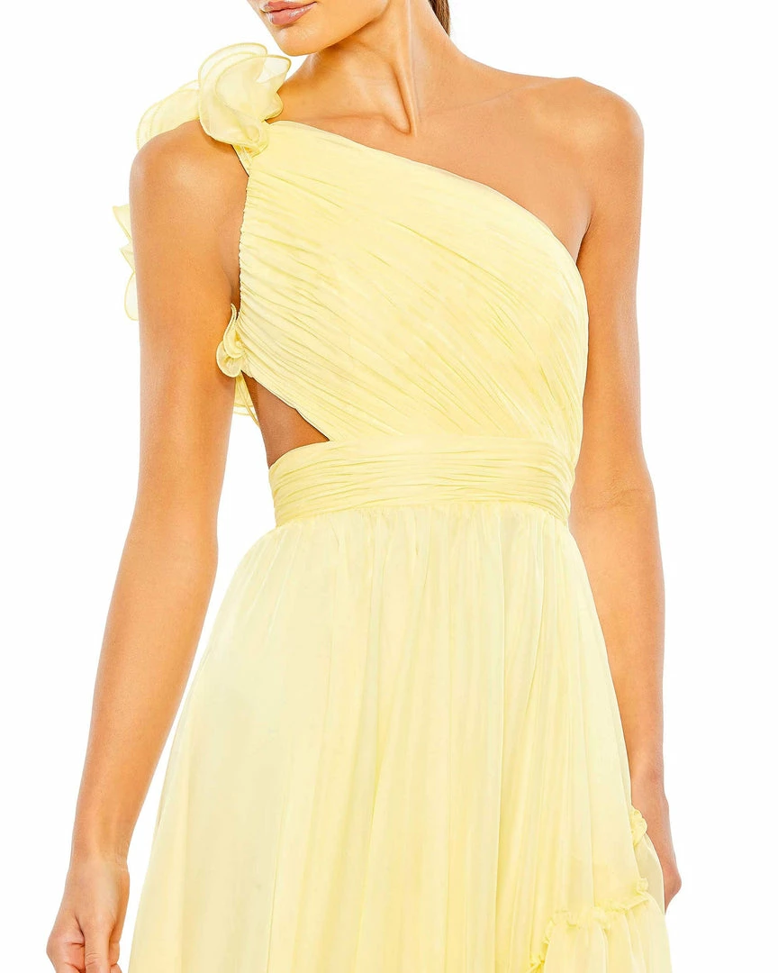 Made from breezy chiffon, the dress is designed with a flirty asymmetrical cut that features a one-shoulder top and diagonal ruffle trim. A frilly shoulder accent and strappy back lacing bring the fashion.