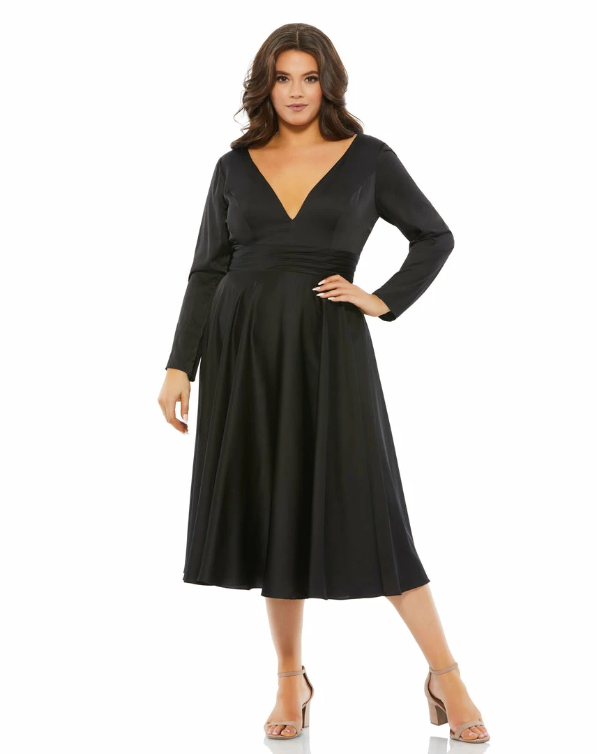 Mac Duggal Satin Long Sleeve Sweetheart Flowy Midi Dress (Plus)