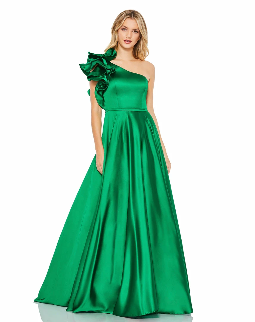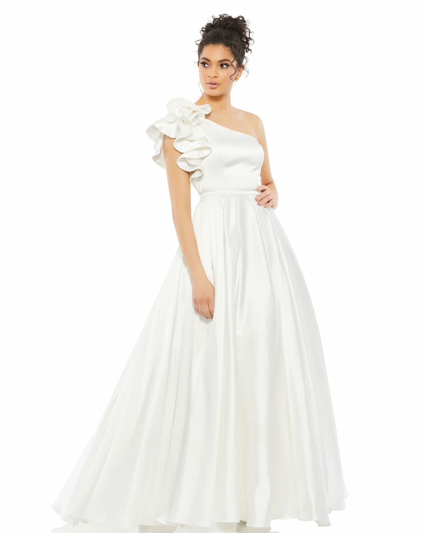 Elegant one-shoulder satin ballgown with an a-line skirt and a dramatic ruffle shoulder