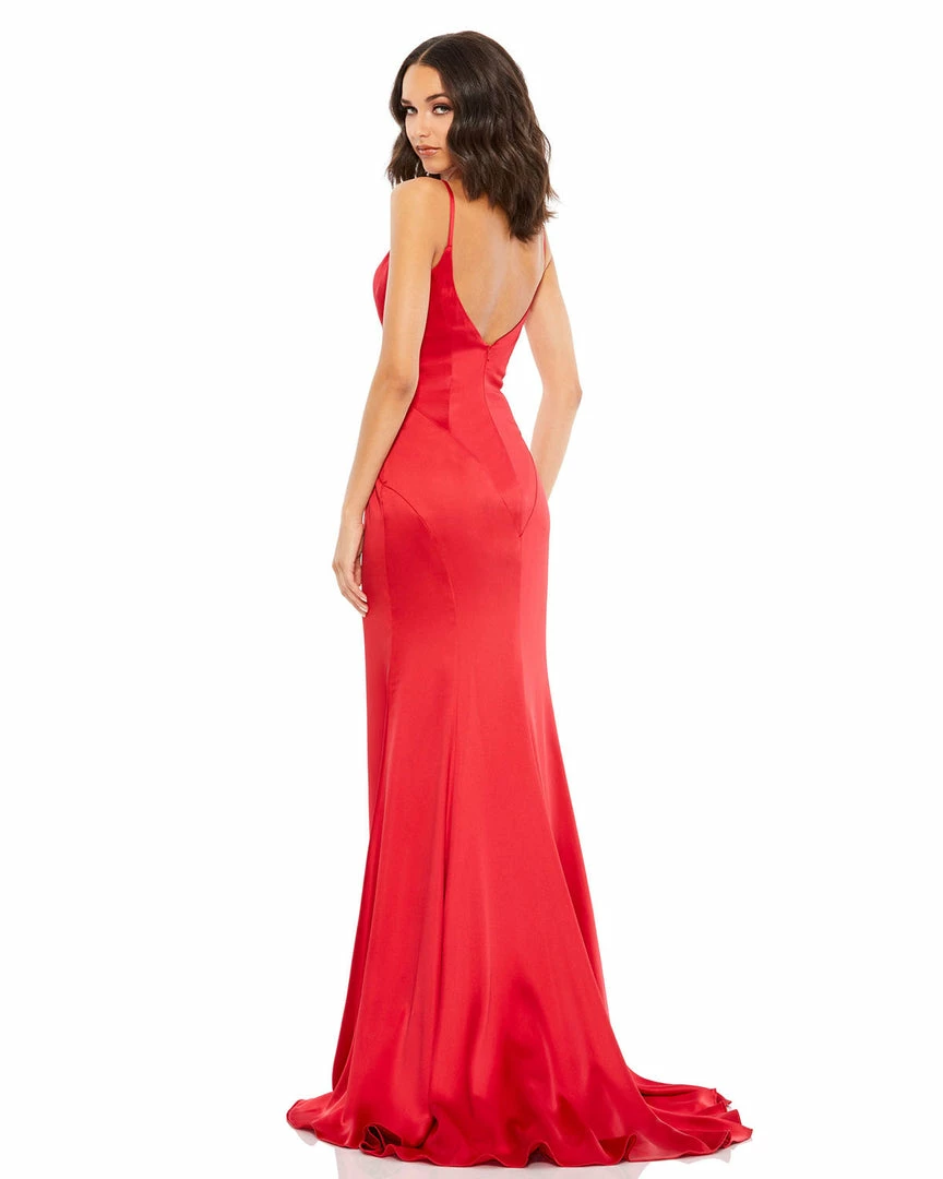 Gorgeous satin v-neck gown features a column silhouette and defined natural waistline.