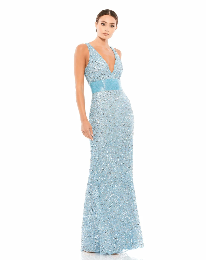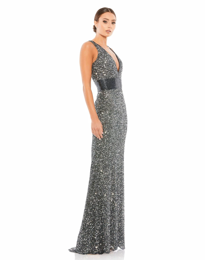 This figure-flattering evening gown is covered top-to-bottom in stunning sequins. The plunging scalloped neckline is trimmed with beads, and a wide hand-beaded waistband cinches in the midsection. The floor-length skirt is finished with a sweeping train.Â