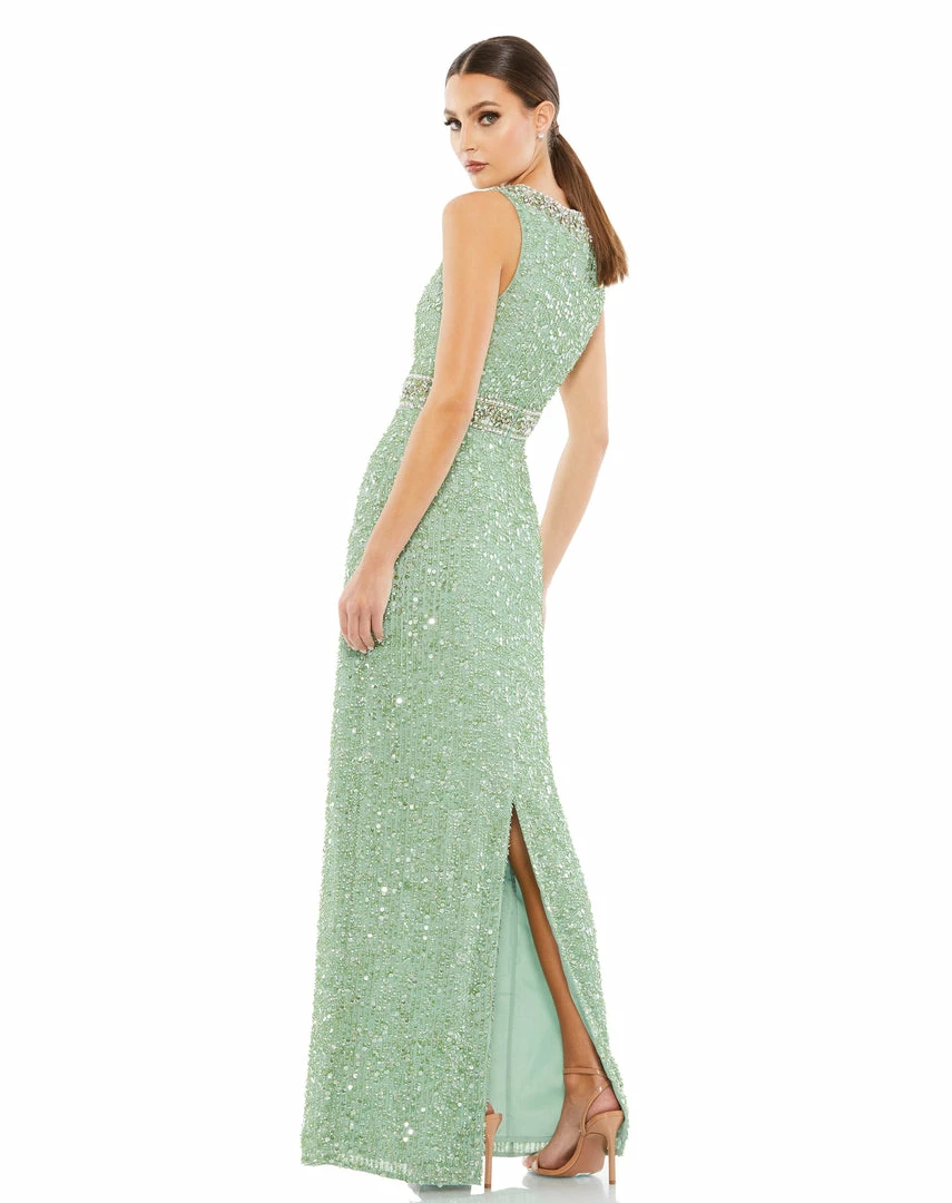 Fully-sequined, floor-length sleeveless column gown featuring a dramatic jewel-embellished collar, a jewel-embellished waist, and a center back slit.