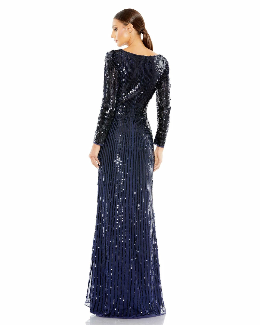 Mac Duggal Sequined Faux Wrap Long Sleeve Gown