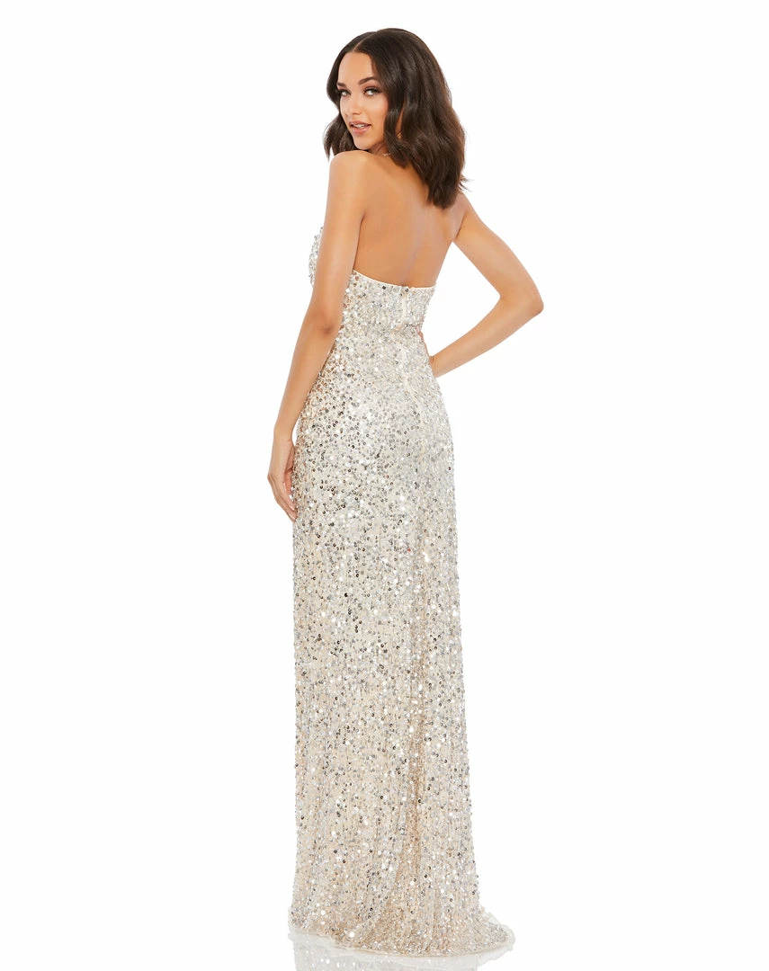 Shimmer on and off the dance floor in this pretty dress perfect for sequin seekers. Cut in a column shape with a plunging halter neckline and sweep train, this dress’ minimalist silhouette lets the maximalist sparkle dominate the design. Add a pendant necklace or a crystal headband to complete head-turning look.