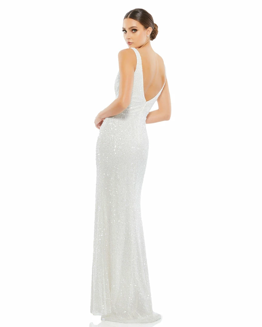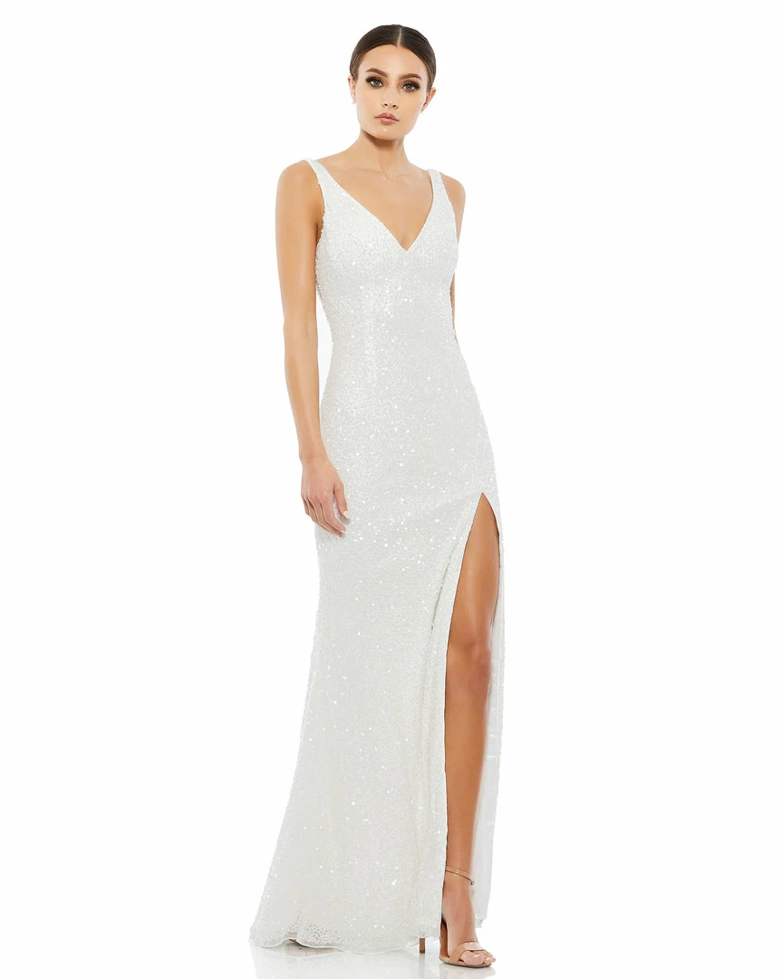 Fully sequined and hand-beaded gown with a plunging v-neckline and low scoop back. Floor length skirt features a high slit and a sweeping train.Â
