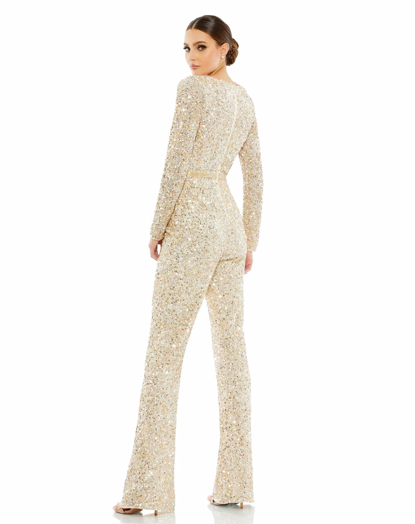 You’ll dazzle in this stunning sequin-decked jumpsuit. A bold alternative to a wedding reception dress or a fun option for NYE, the show-stopping one-piece is styled with a low neckline finished with an inset of mesh, fitted long sleeves, a beaded belt, and a gently flared leg.