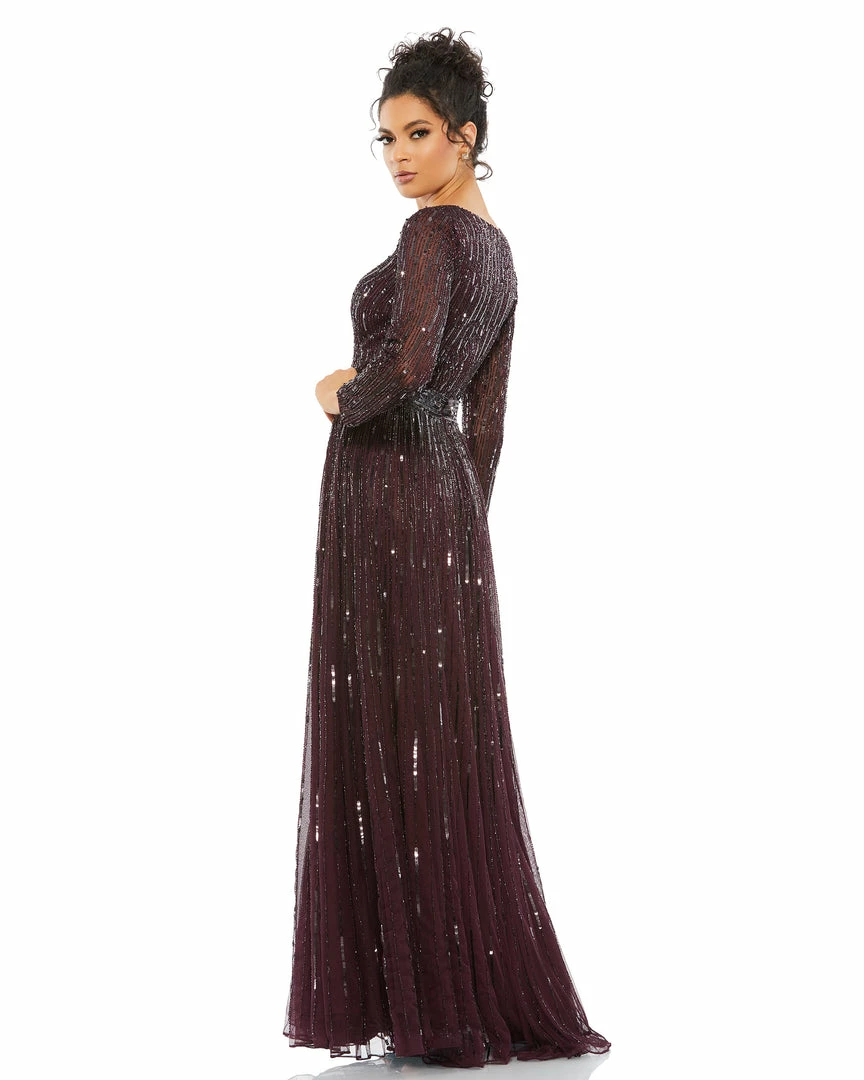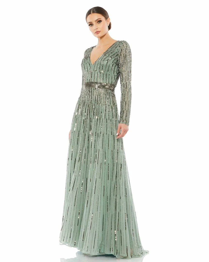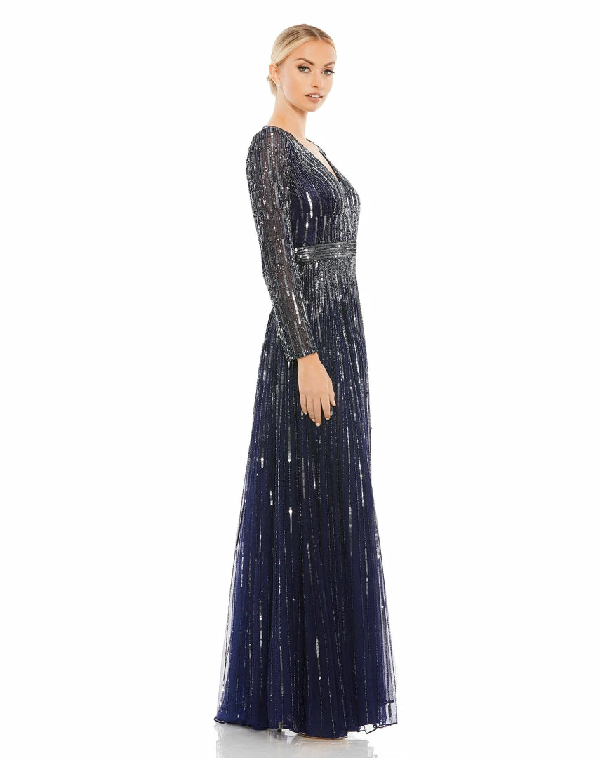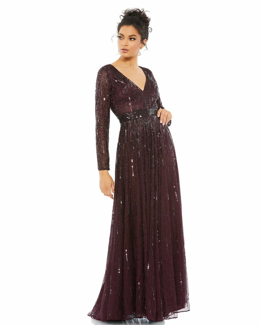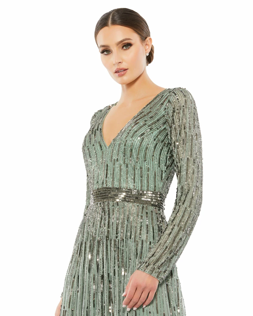Beautiful long-sleeve evening gown with a plunging v-neckline, cascading sequins throughout, and a sequined belt.