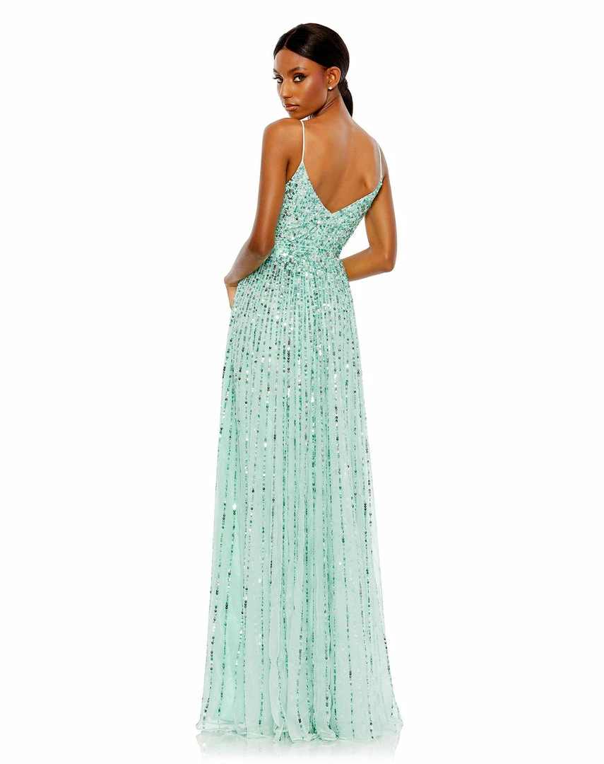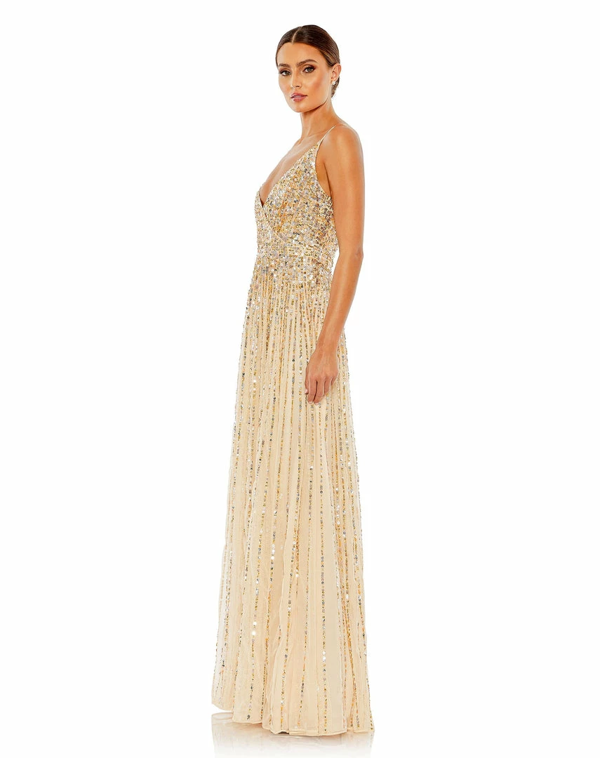 This flawless gown is crafted from light, dreamy fabric designed with a beautiful embellished bodice and sequin-striped skirt. Striking the perfect balance between fitted and full, the A-line gown is easy to walk, dance and spin in.
