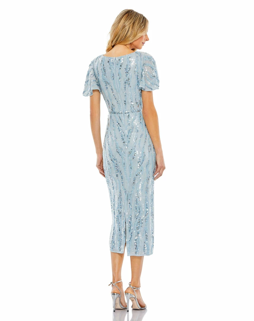 Mac Duggal Sequined V Neck Flutter Sleeve Tea Length Dress