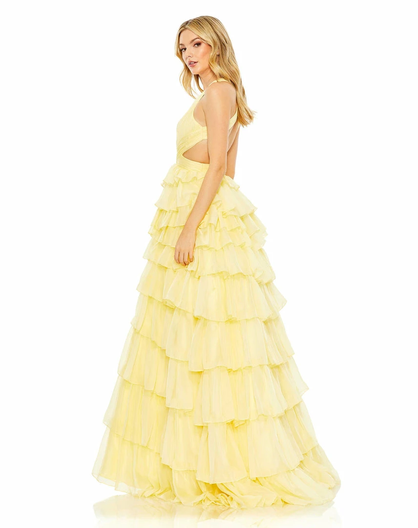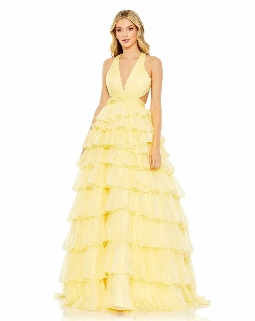 This bold prom dress is styled with a pleated bodice with a deep neckline, waist cutouts, and crisscross center. Layers of graduated ruffles fill out the full skirt for a design that’s festive and flirty.