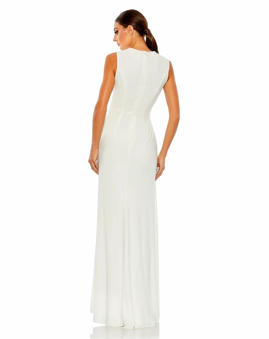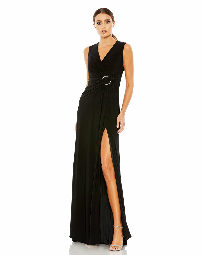 Comfortable. Elegant. Glamorous. This sleek jersey gown is everything to us. Designed with a wrap-style bodice, the dress is fashioned with texture-enhancing gathers that surround a waist twist and round, rhinestone buckle. The dress has a sexy leg slit that creates easy movement and a simple, clean-lined back finished with a concealed zip closure.