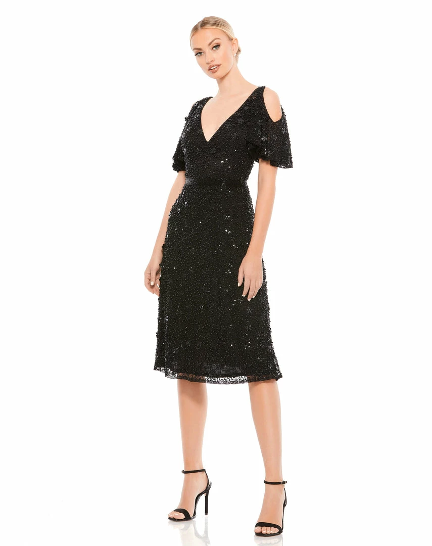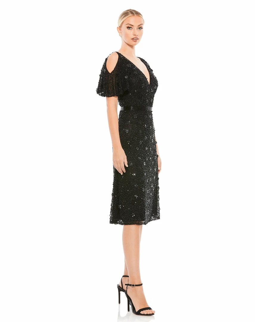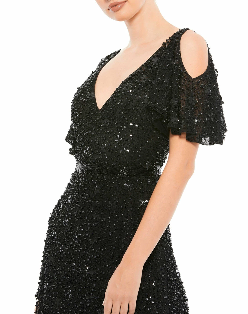 Fully beaded cocktail dress with tonal floral accents, flowy bell sleeves, shoulder cut outs, and a hand-beaded belt.